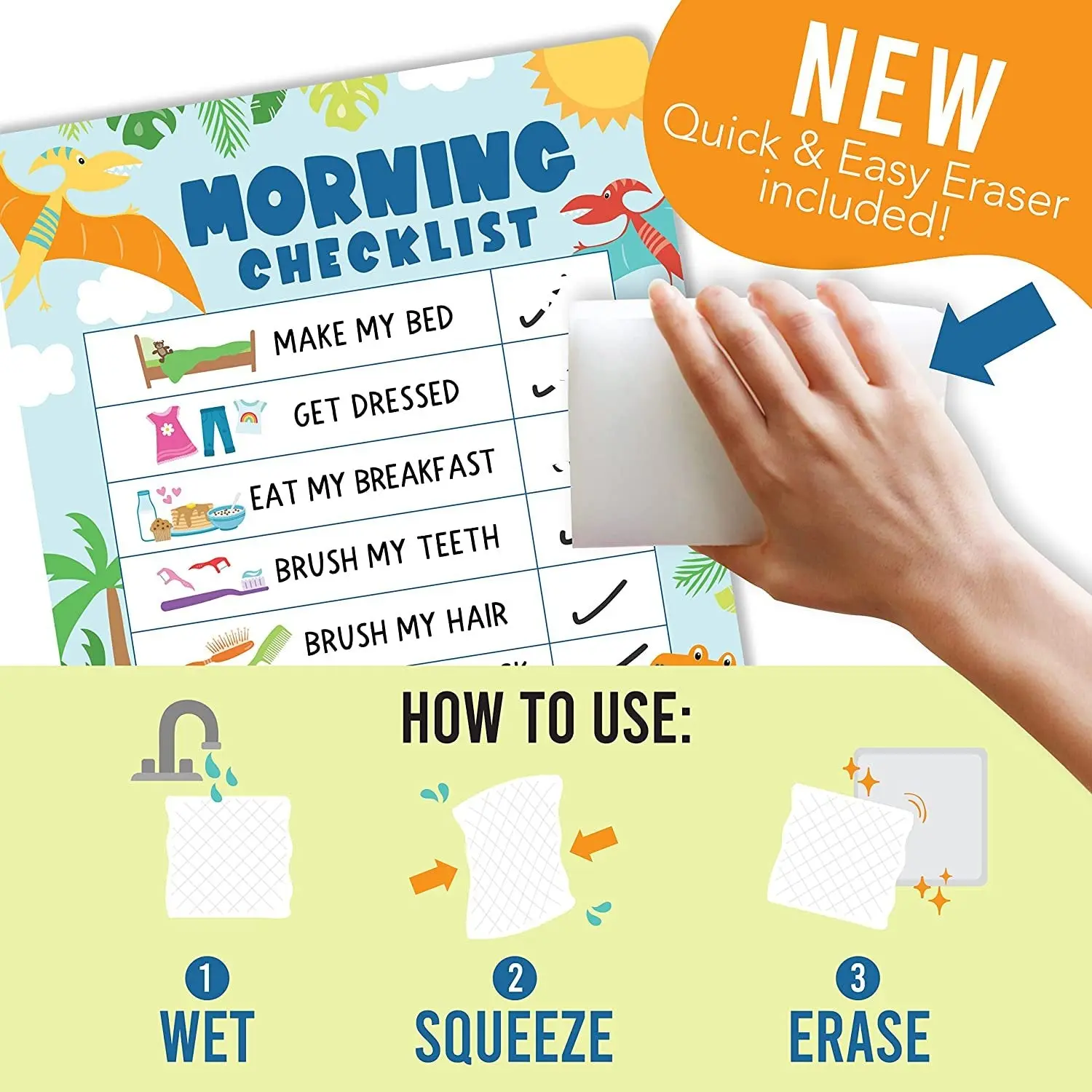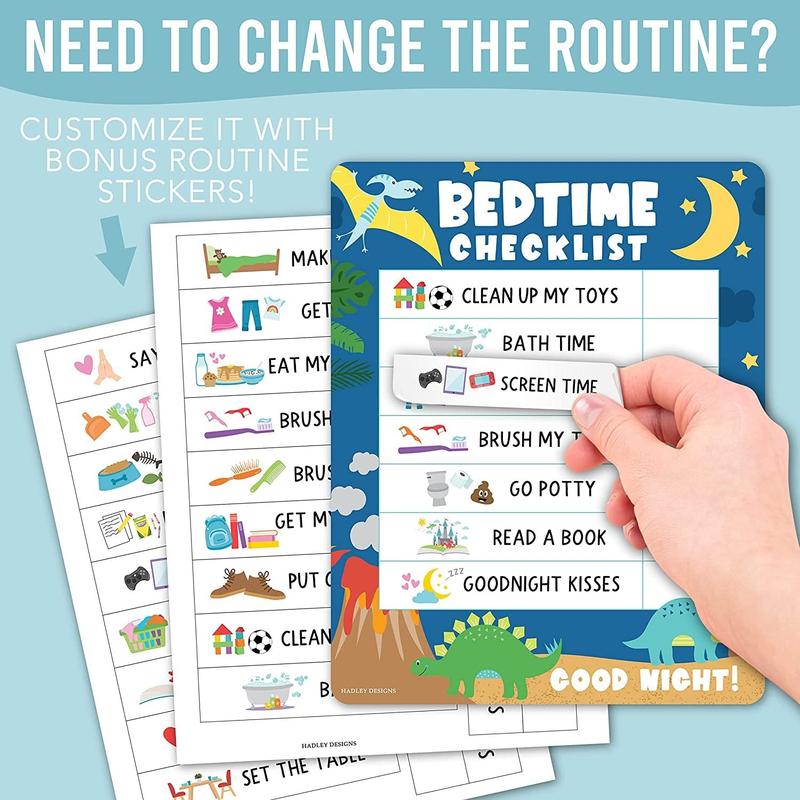 You'll receive 2 sticker sheets, 1 dry erase marker, and 1 melamine eraser. This toddler chart gives kids a sense of achievement and motivation to complete tasks. It's a daily schedule chart for kids, a reminder chart, and a responsibility chart for ages 4-8. Personalize two habits for continuous motivation.