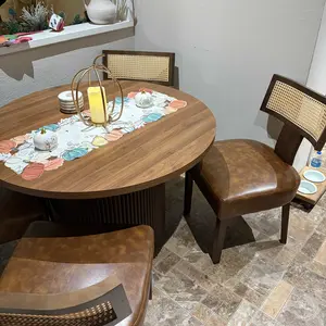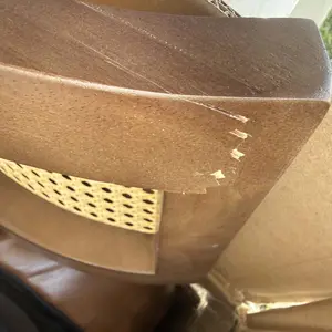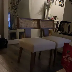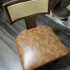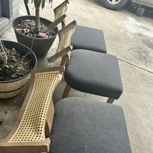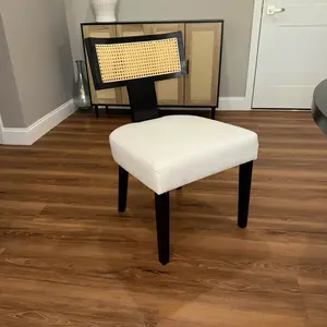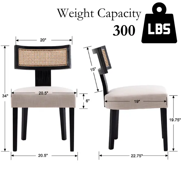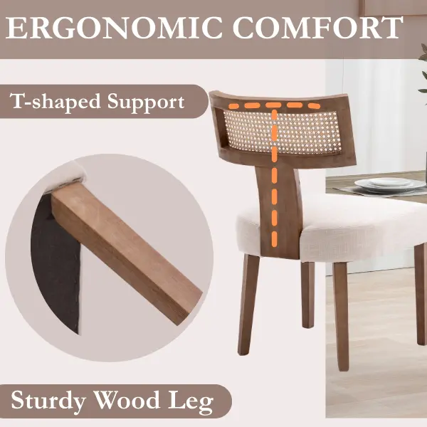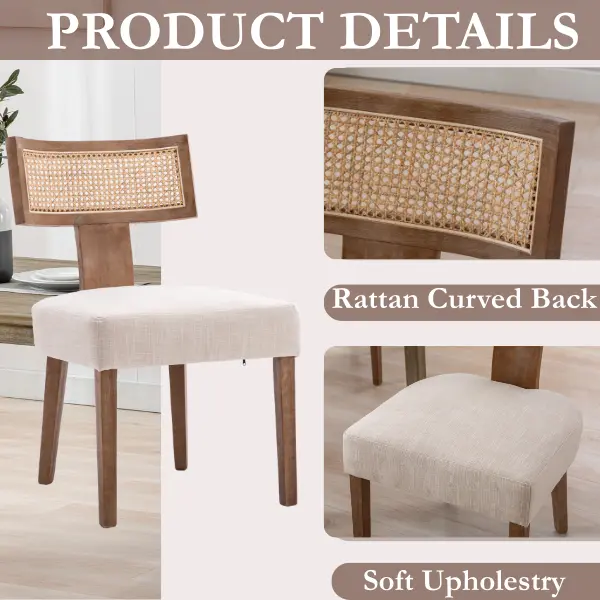 Armless design with a natural rattan backrest ensures comfort. Splayed legs and foam cushion upholstery add to the ergonomic appeal. The curved backrest provides support, making these chairs perfect for long hours of use. Enjoy a cozy, modern look in your kitchen or dining area.