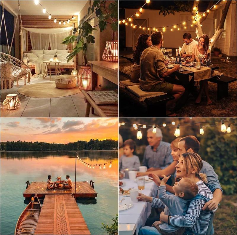 【Widespread application】: Patio string lights are ideal for both indoor and outdoor lighting. They are great decorations for bistros, balcony patios, courtyards, backyards, decks, weddings, tents, pergolas, pool umbrellas, Christmas, and Halloween parties. They enhance the beauty of the landscape and provide a pleasant lighting effect