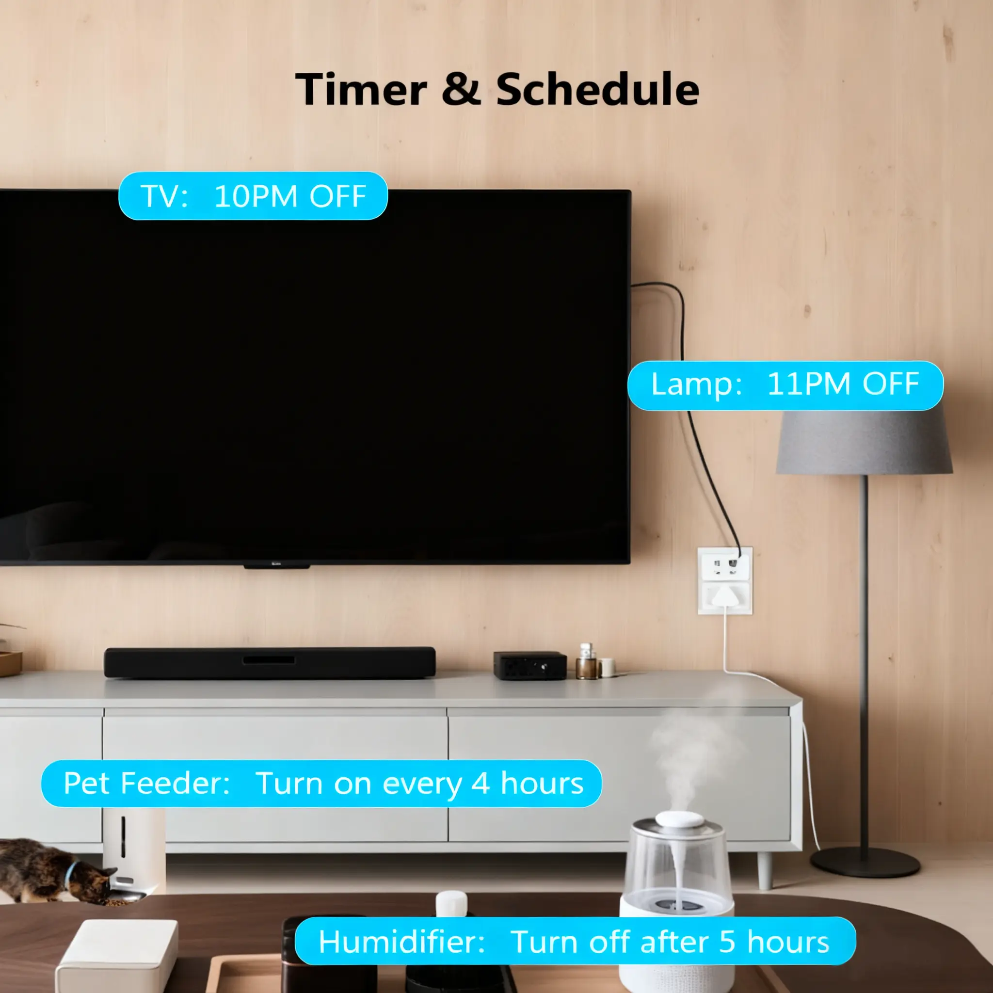 Easily set timers, countdowns, or recurring tasks. For example, set your lights to turn on at 8 a.m. or your humidifier to turn off after 5 hours. Simplify your daily routines.