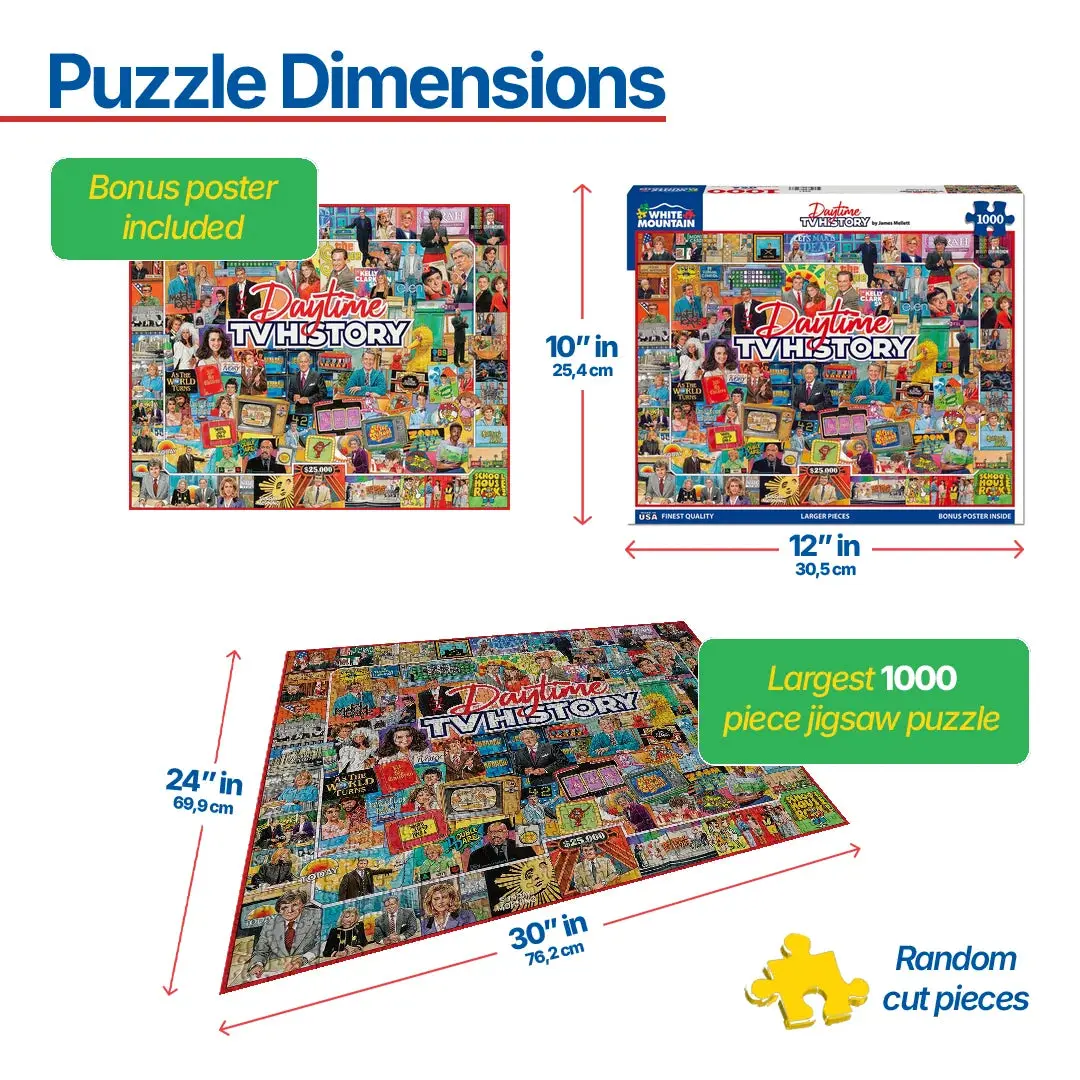 2051 Daytime TV History. What did you grow up watching? From cartoons you watched daily to soap operas and game shows our grandmothers watched, artist James Mellett made sure to include them all in this 1000 piece collage style jigsaw puzzle. Finished size 24" x 30".