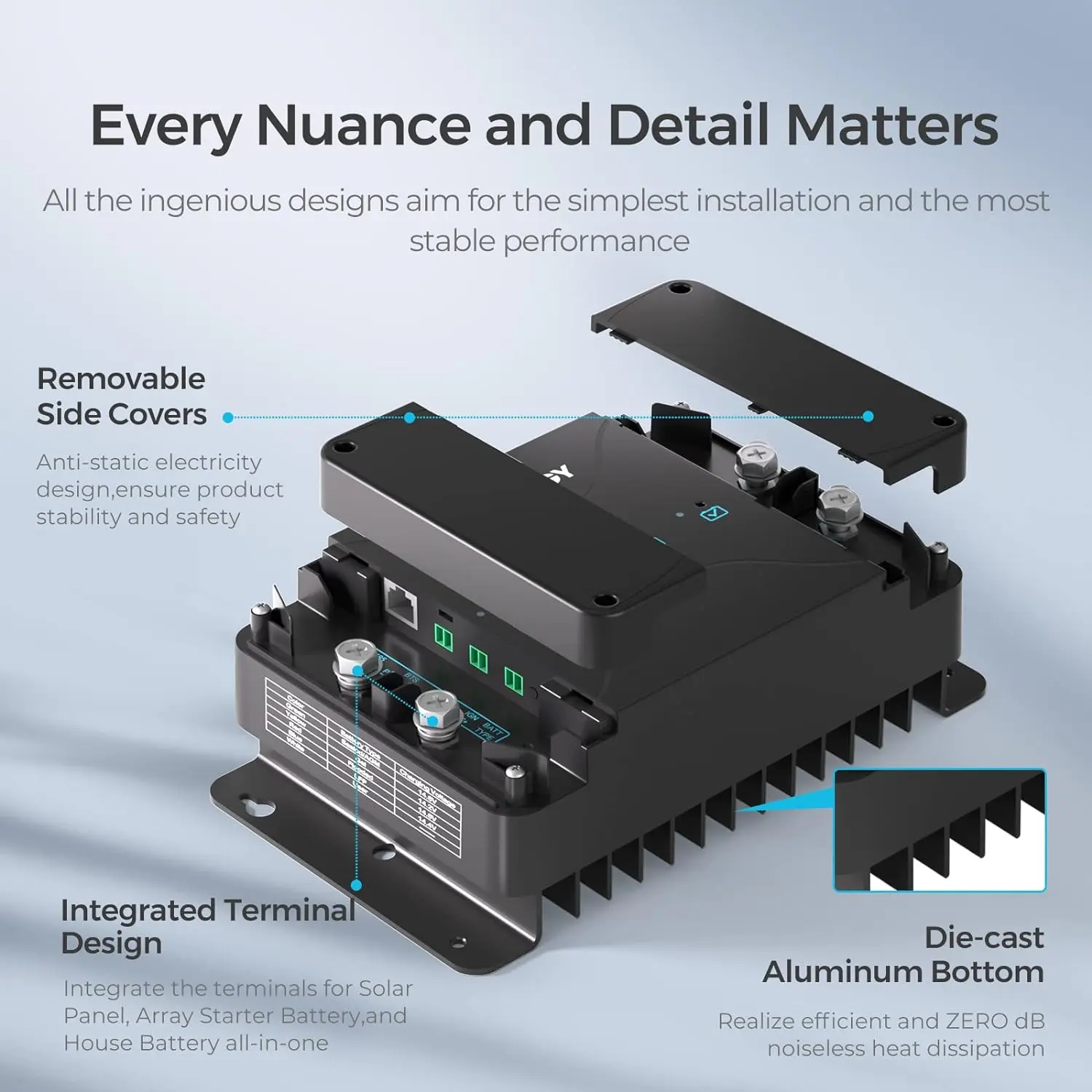 ·【3-phase MPPT Charging Technology】 With Built-in Maximum Power Point Tracking (MPPT), Renogy DC-DC On-Board Battery Charger will charge your service batteries with maximized solar power, providing 3-phase charging (Bulk, Boost and Float) to regulate the whole charging and ensure the batteries will be accurately charged at the correct voltage levels to 100%.