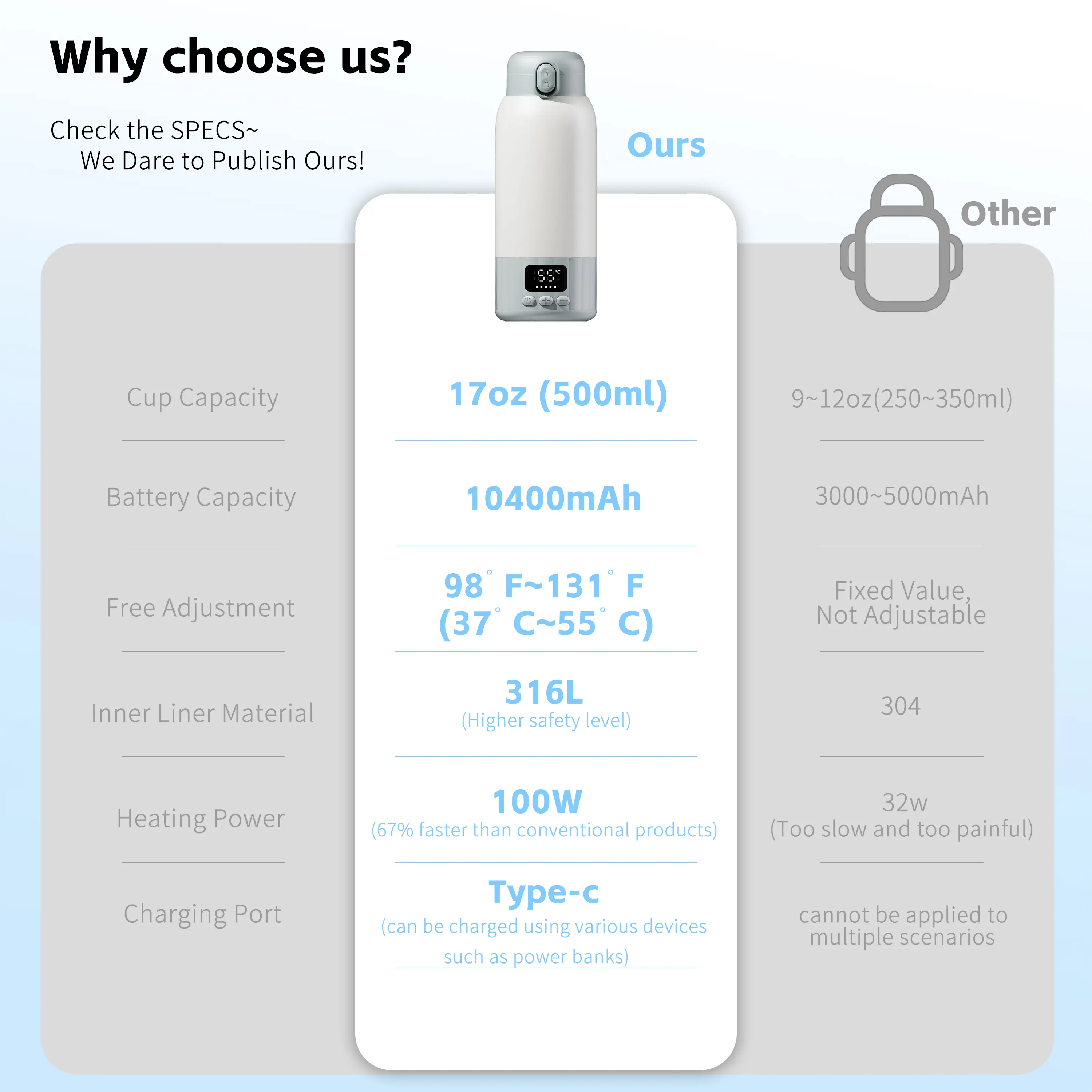 Whether it's nighttime feedings, traveling, or preparing warm water daily, this portable bottle warmer delivers the perfect temperature experience anytime, anywhere. We've combined portability, speed, safety, and smart features into this compact yet powerful device, empowering every parent to effortlessly handle all childcare needs.