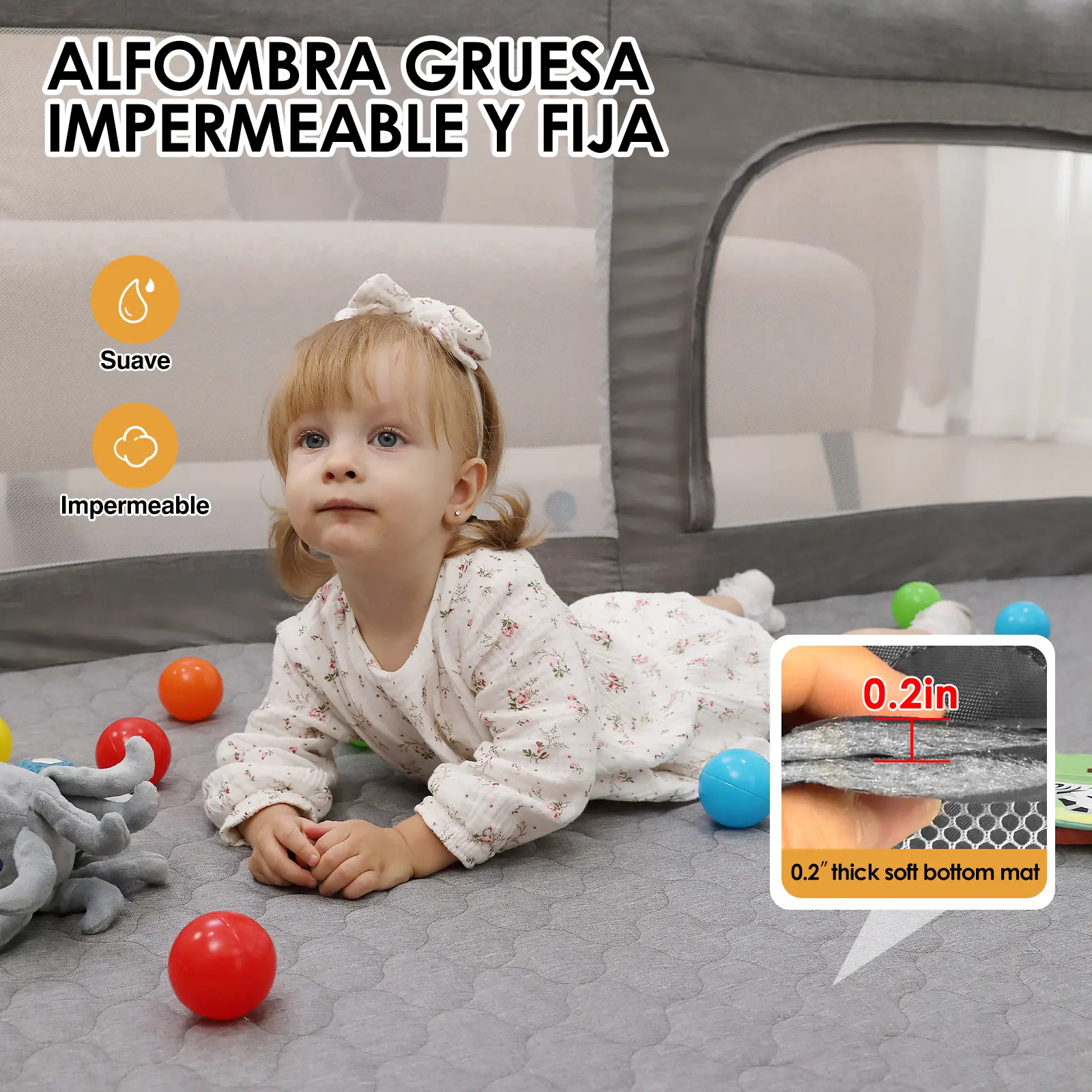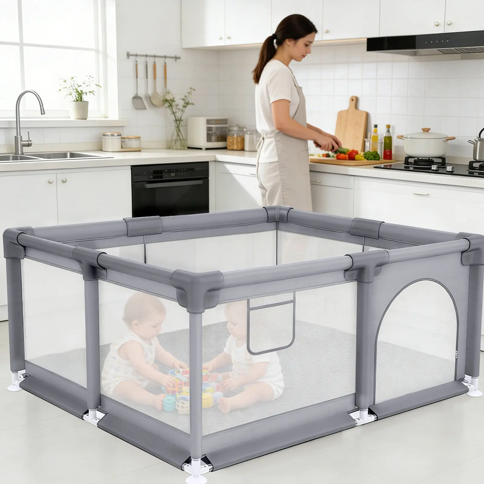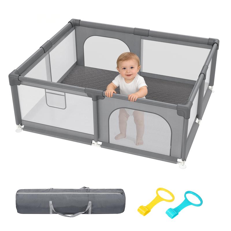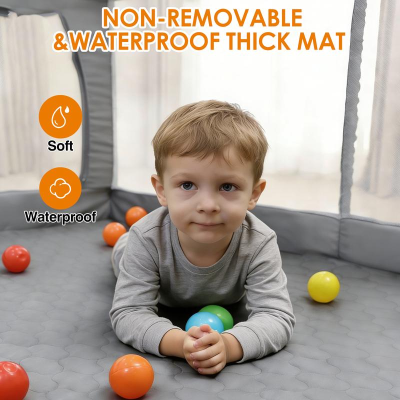 The playpen is gray, adding versatility to any room. It is easy to assemble and clean, making it a practical choice for parents. The playpen is divided into two types: with mat and without mat. The mat is connected to the fence and has a different thickness.