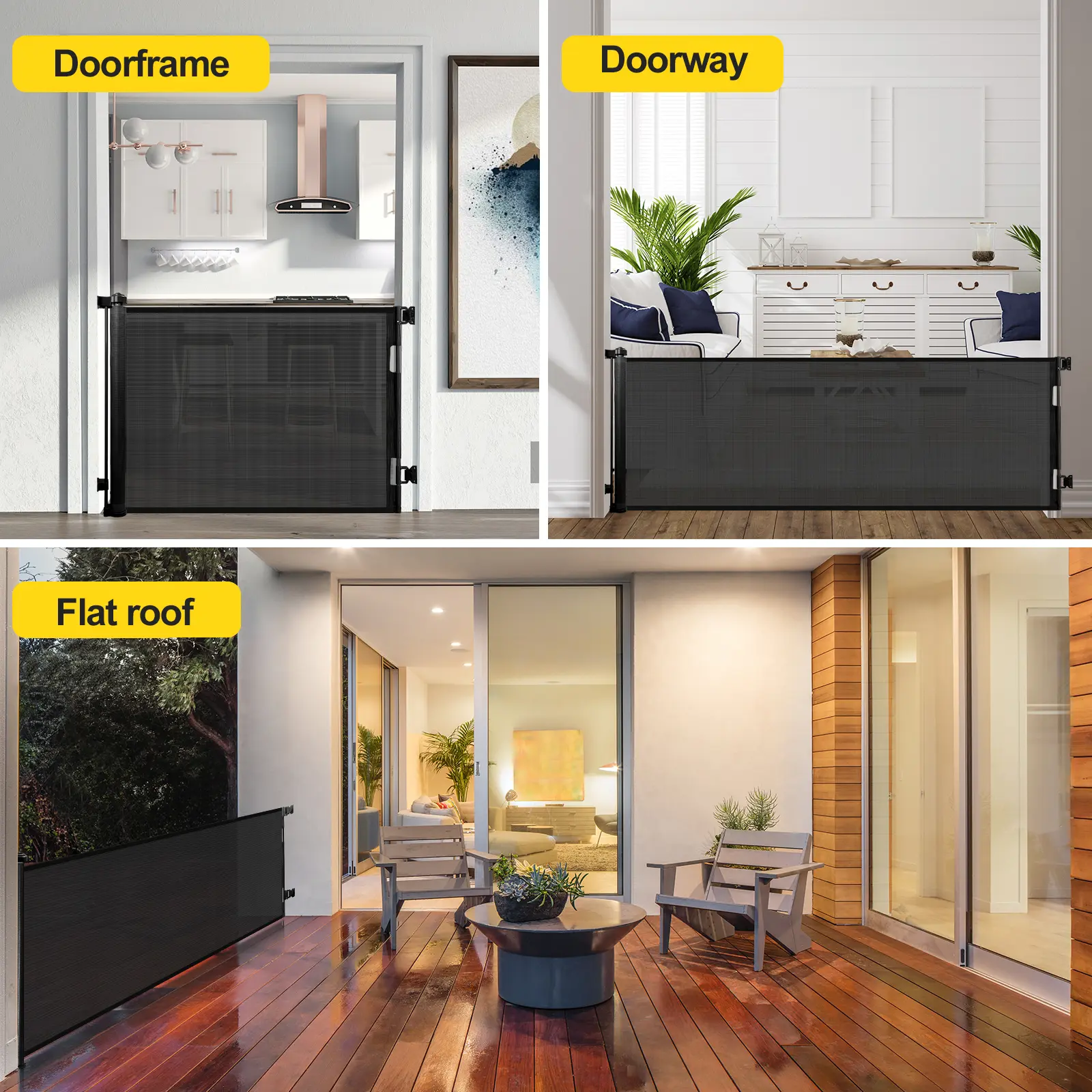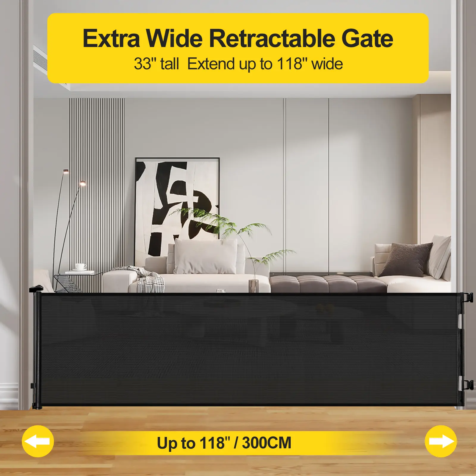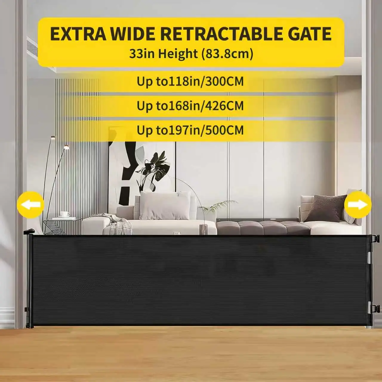 The Retractable Baby Gate is a versatile safety solution for your home. It measures 33.6" tall, extending up to 55", 71", 118", 168", and 197" wide. Perfect for doorways, stairs, hallways, and both indoor and outdoor use. Available in black and grey, it blends seamlessly into any decor. Keep your child safe while adding a touch of elegance.