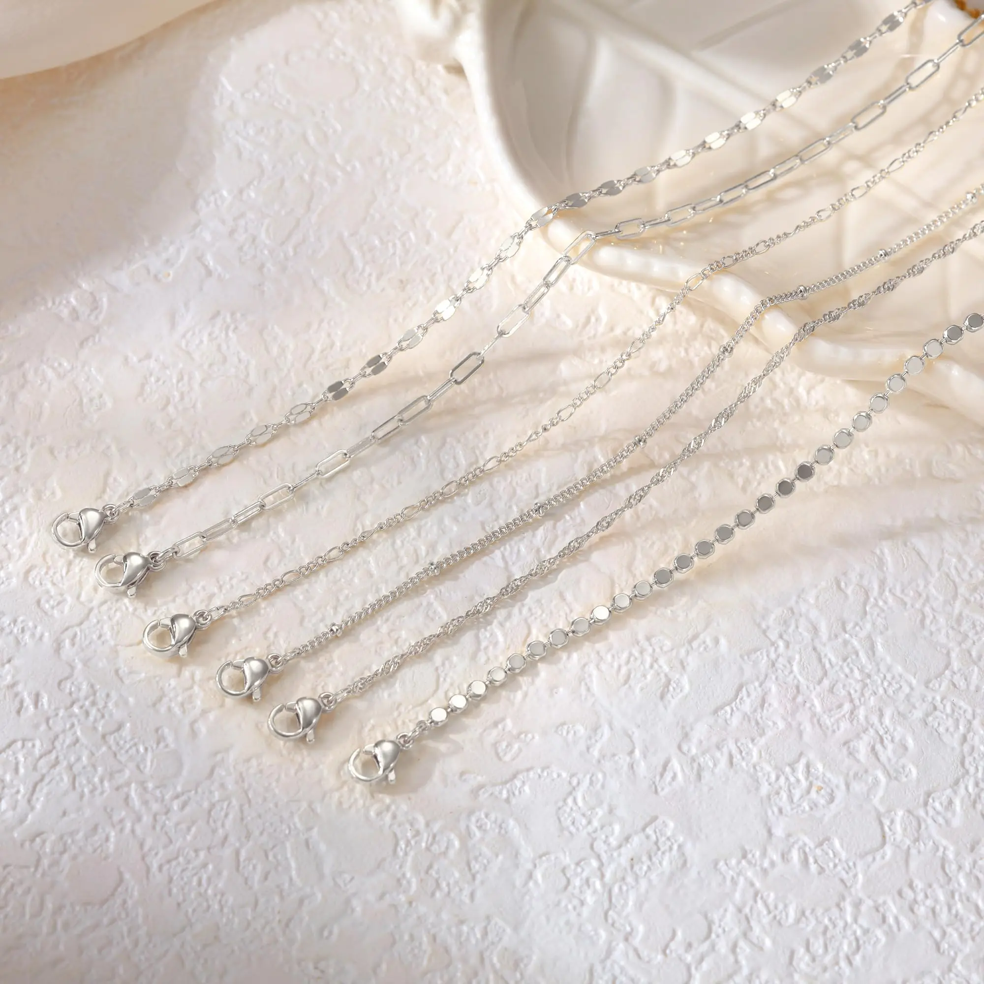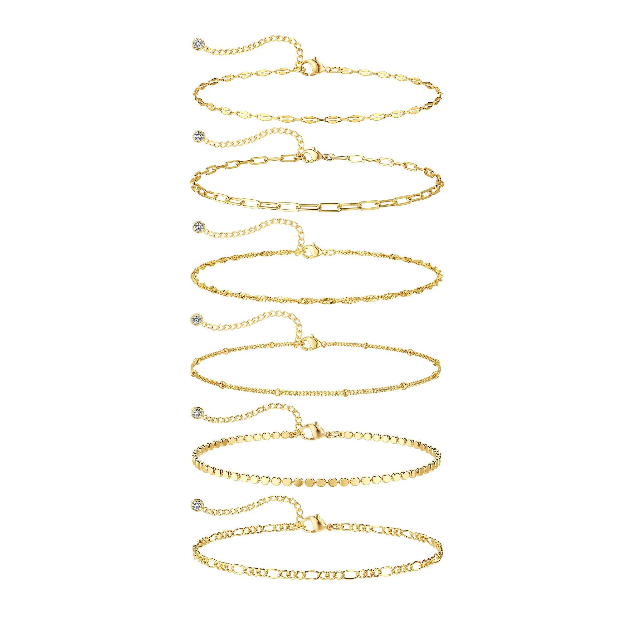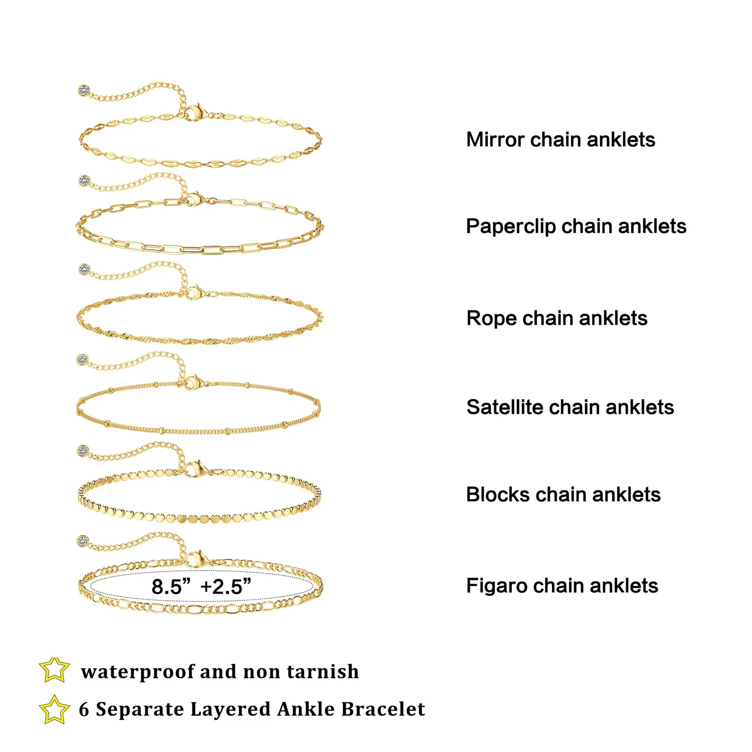 ·This anklet set features six unique designs: paperclip chain, square chain, and Figaro chain. Each design has distinct textures. Worn alone, it exudes simplicity. Layered, it showcases sophistication. 🌟