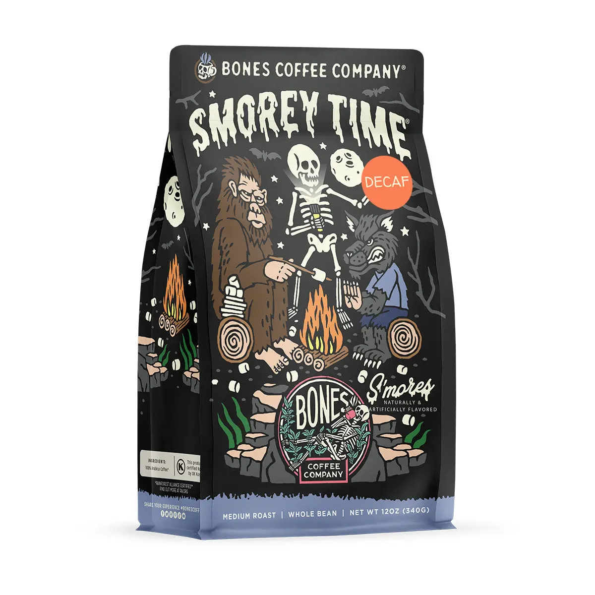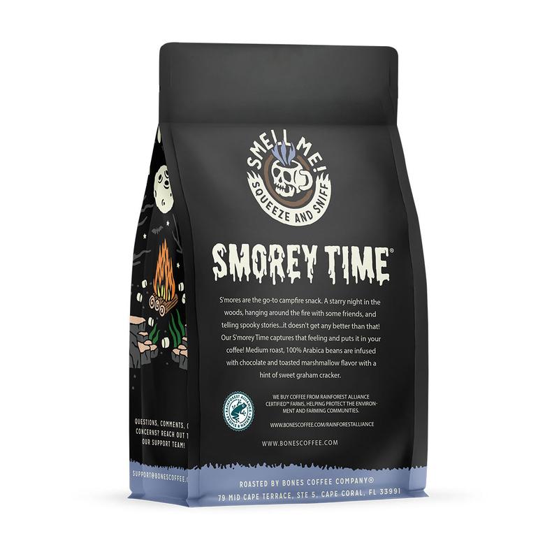 The campfire flavor; Our Smorey Time decaf captures the taste of s'mores roasted over a campfire; low acid coffee made from medium roast arabica beans infused with chocolate and toasted marshmallow flavor with a hint of sweet graham cracker.