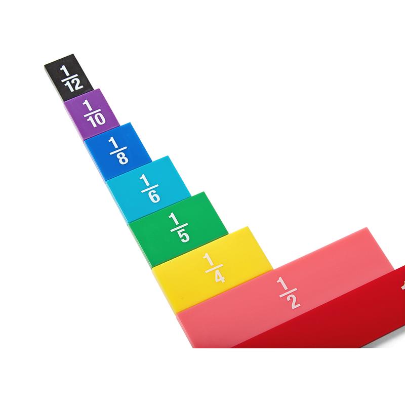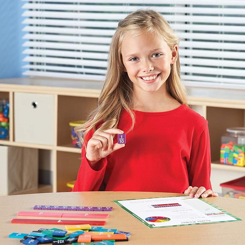Enhance students' comprehension of the relationship between decimals and fractions. These double-sided proportional tiles show fractions on one side and decimals on the other to allow exploration of equivalencies. Rainbow fraction tiles represent a whole, halves, thirds, fourths, fifths, sixths, eighths, tenths, and twelfths. Largest tile measures 1" x 8".