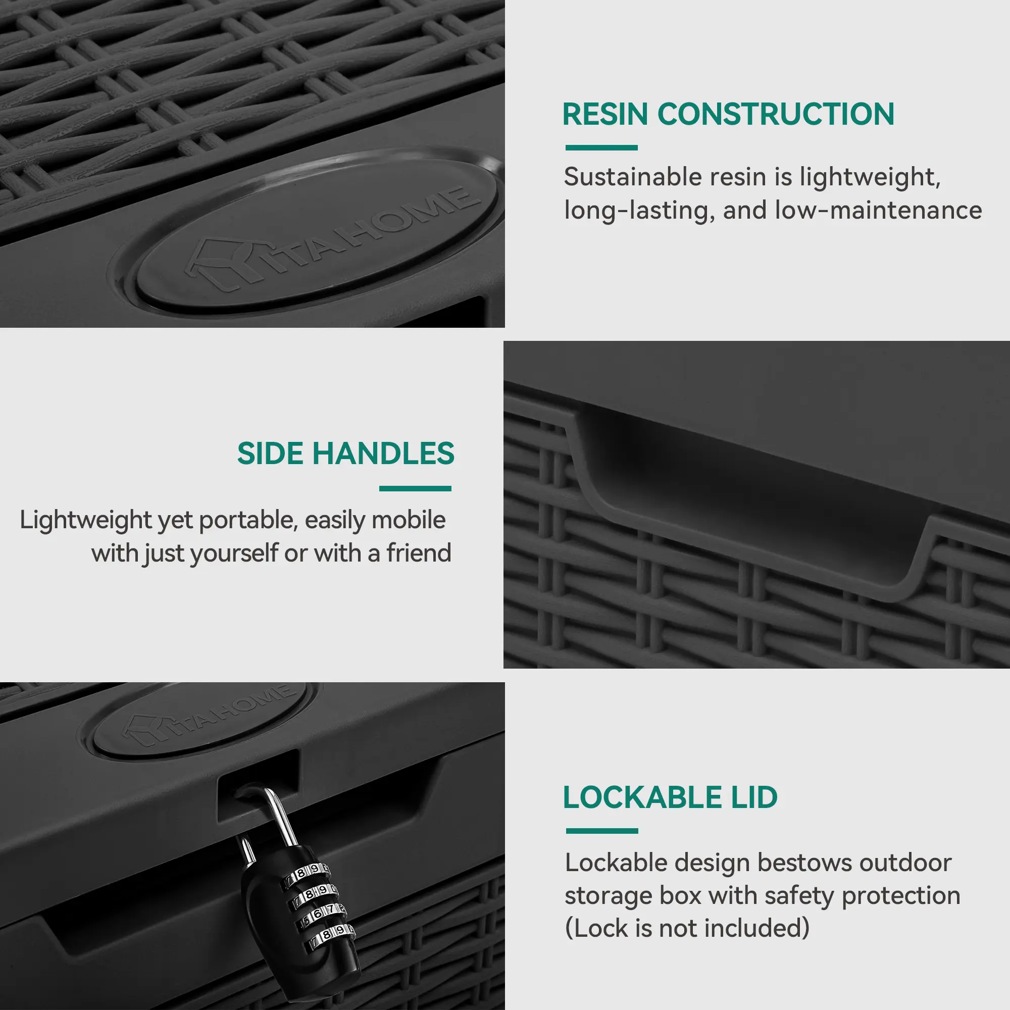 Sleek and Practical: Our deck box is designed with side handles for easy mobility, while the lockable design enhances security; Its unique appearance seamlessly complements your furniture