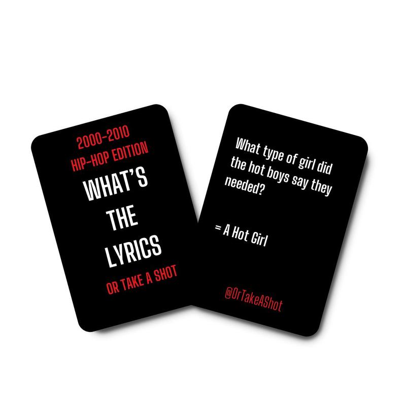 Finish the Lyric / 2000s-2010s Hip Hop Trivia Card Game! Test your lyrical knowledge with iconic tracks. Prove you're a true hip-hop fan by answering challenging questions about the biggest hip-hop songs. Choose to play for shots or points. Fun for everyone, this game offers challenges for all knowledge levels. Perfect for game nights!