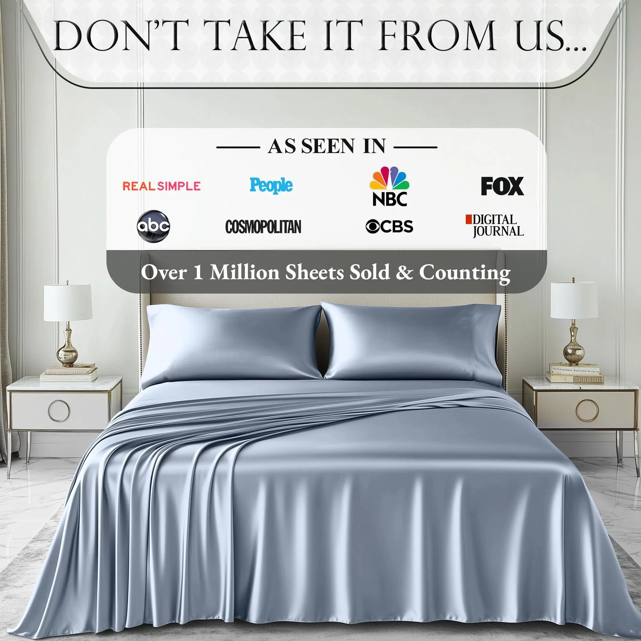 Suitable for all bed & mattress sizes, our cooling satin silky sheets bed set includes a flat silk sheet, fitted sheet with a deep elastic pocket, and matching silky pillowcases.
