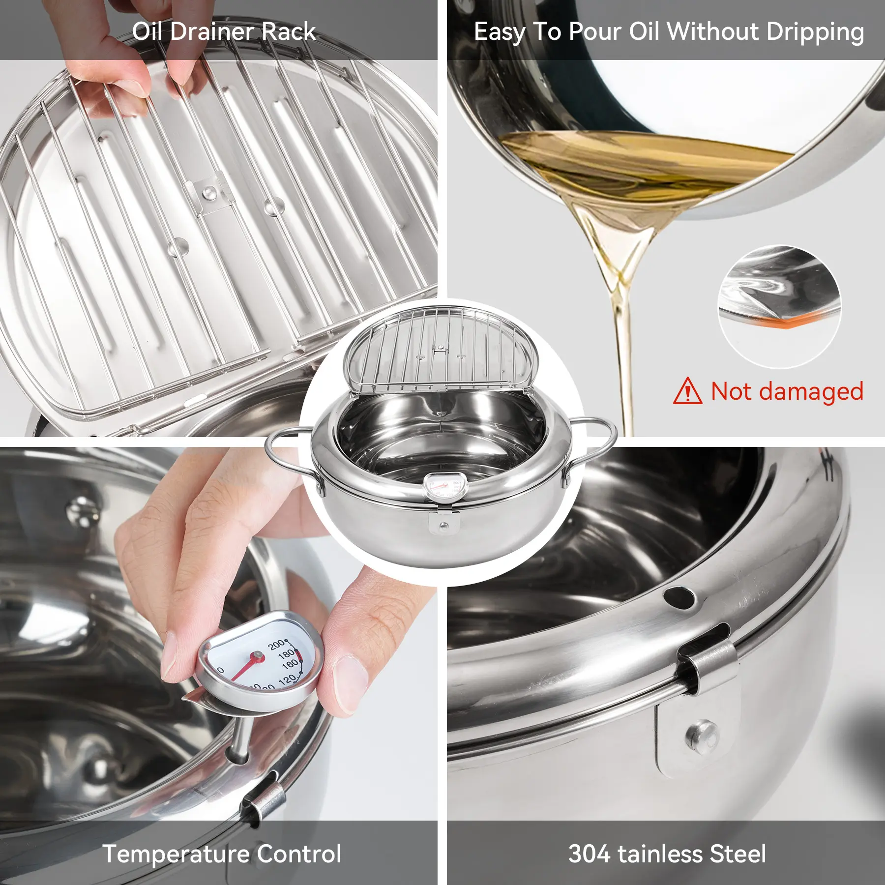 ·UNIQUE DESIGN: When frying a large amount of food at one time, our lid design can safely prevent oil from splashing. After the food is fried, you can put the food on the lid of the pot to control temperature and drain the oil, so that the food obtained is more delicious.Then waiting for oil flow down to the pot, pour out the cooking oil by the beak diversion port will be easier.