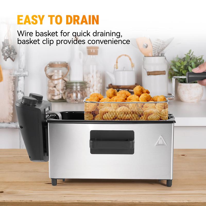 ·ADJUSTABLE CONTROL - The electric deep fryer has adjustable thermostat(302°F - 374°F) and timer. Signal light indicates when oil is ready for frying. Set the temperature and time according to your frying needs, freely make french fries, onion rings, fried chicken and other foods.