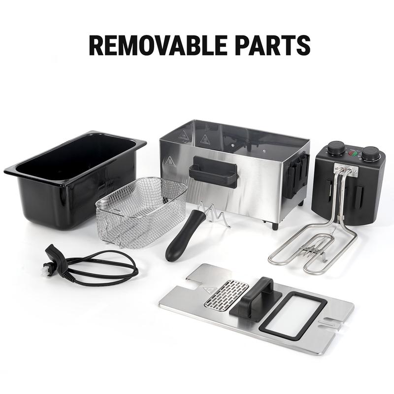 ·EASY TO CLEAN - All fryer pot parts are removable. You can use a damp cloth to wipe the heating element and stainless steel body to cleanup. The enamel-coated oil tank, cooking basket and lid are dishwasher safe.