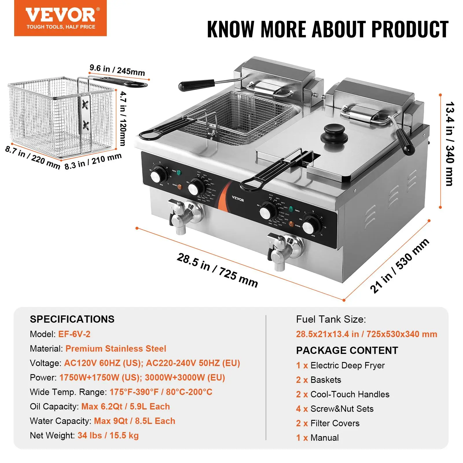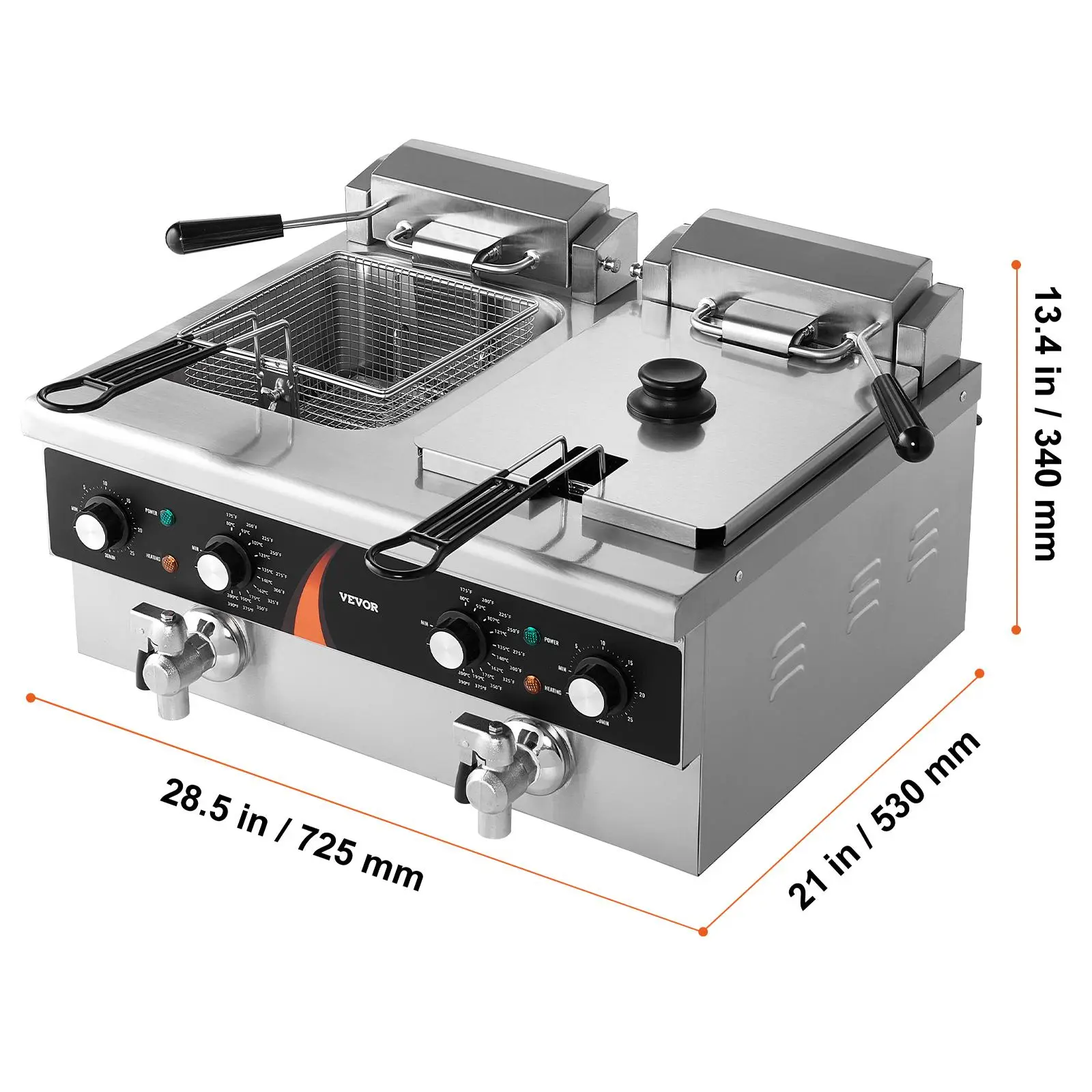 • Large Capacity: With two separate oil tanks (Water Capacity: Max 9Qt/8.5L each, Oil Capacity: Max 6.2Qt/5.9L each), this commercial electric deep fryer allow you fry different types of foods individually and maintain distinct flavors. Perfect for delis, concession stands, snack bars, and parties.