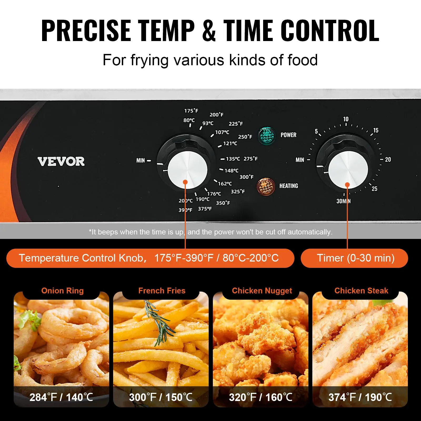 • Temp & Time Control: You can easily adjust the temperature from 175°F to 390°F (80-200°C). No matter what, you will be ready to bring on the heat! This deep fryer will automatically shut off when the temperature is over 446℉(230℃) or the temperature controller breaks down. In addition, it is designed with a timer, so you won't miss a thing.