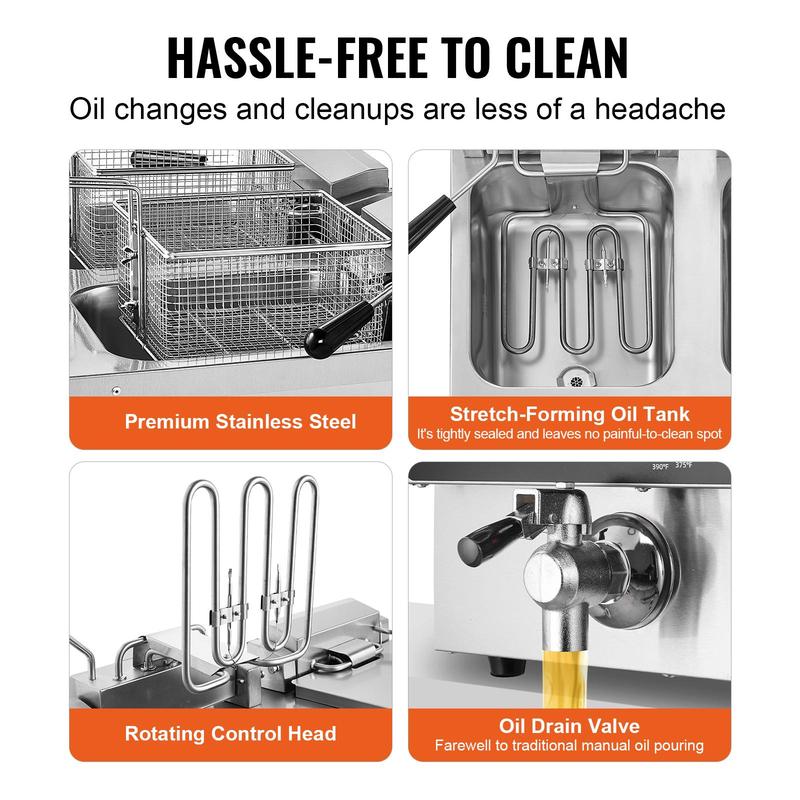 • Clean with Ease: The stretch-forming oil tank is tightly sealed and leaves no painful-to-clean spot. Its heating tube can be easily flipped up, which facilitates an easier cleaning after every use. It’s easy to wipe down. Also, it comes with dual front-mounted drain valves for effortless oil release. Note: 1. PEEL OFF any white plastic protective film on the surface. 2. Make sure the machine is cleaning cool and dry before string. 3. Use separate socket plates for each of the two plugs.