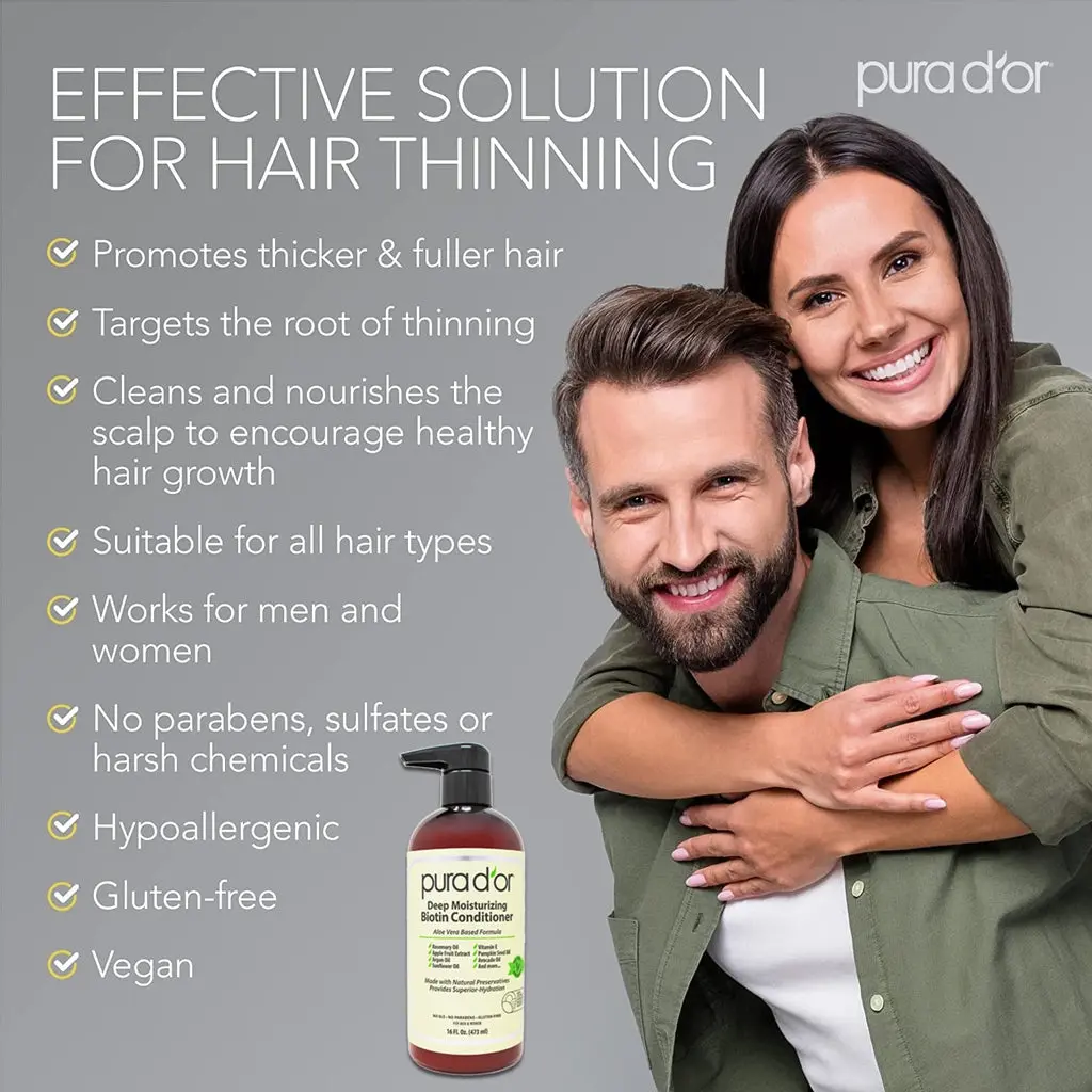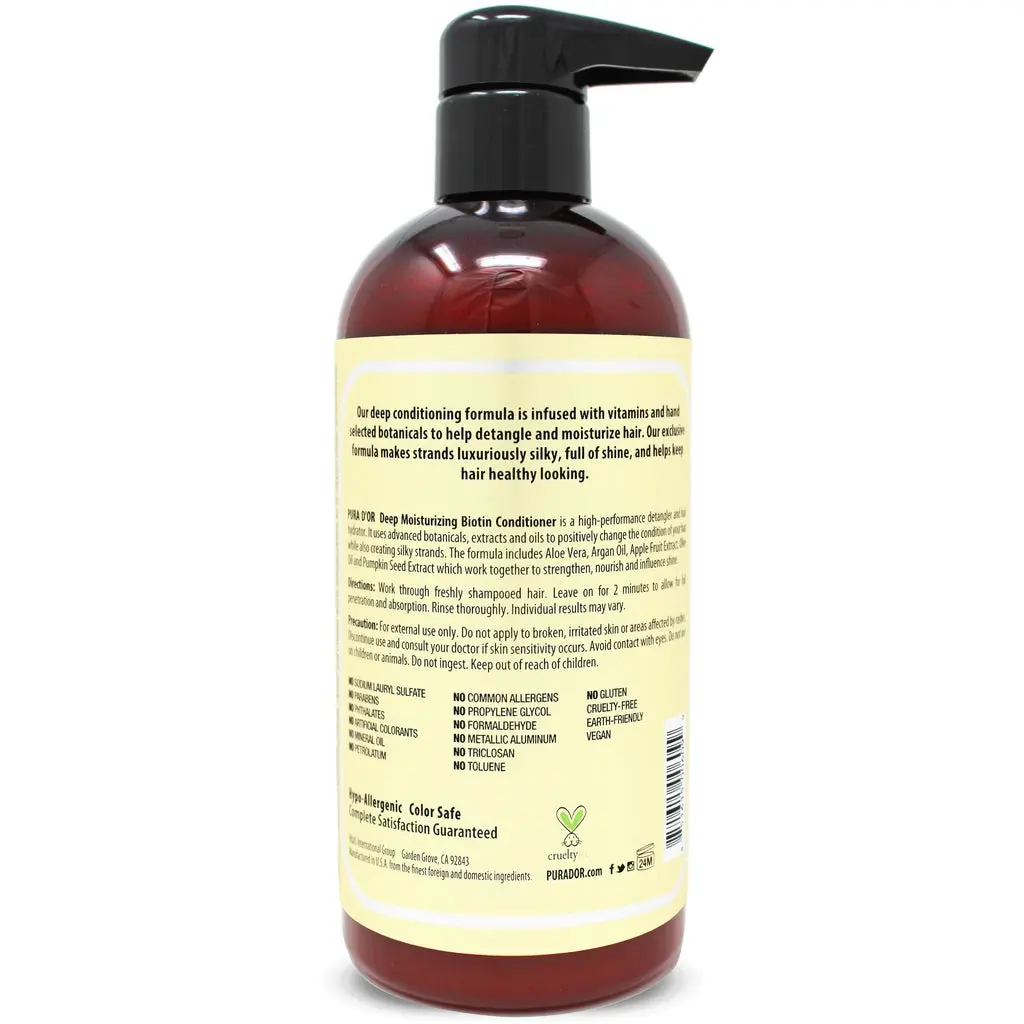 The Deep Moisturizing Biotin Conditioner is a 16 oz haircare product. It is formulated with aloe vera-based ingredients, including rosemary oil, apple fruit extract, argan oil, pumpkin seed oil, avocado oil, and sunflower oil. This conditioner contains natural preservatives and provides superior hydration. It is suitable for men and women.