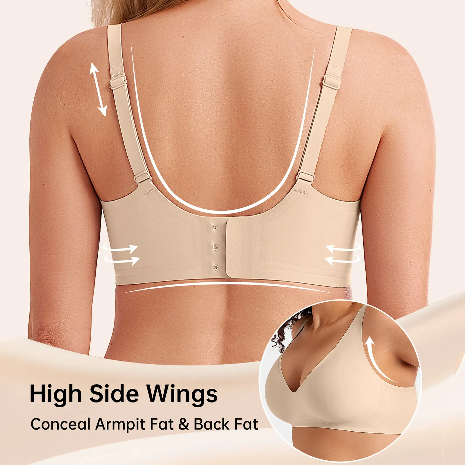 This is absolutely nothing like the pictures or the advertisements. It’s supposed to have a wide back but goes to the thin little class that isn’t in any photo or video posted of it. The material feels nice, but the thin inserts inside the bra are the equivalent of what’s in a bathing suit top.
