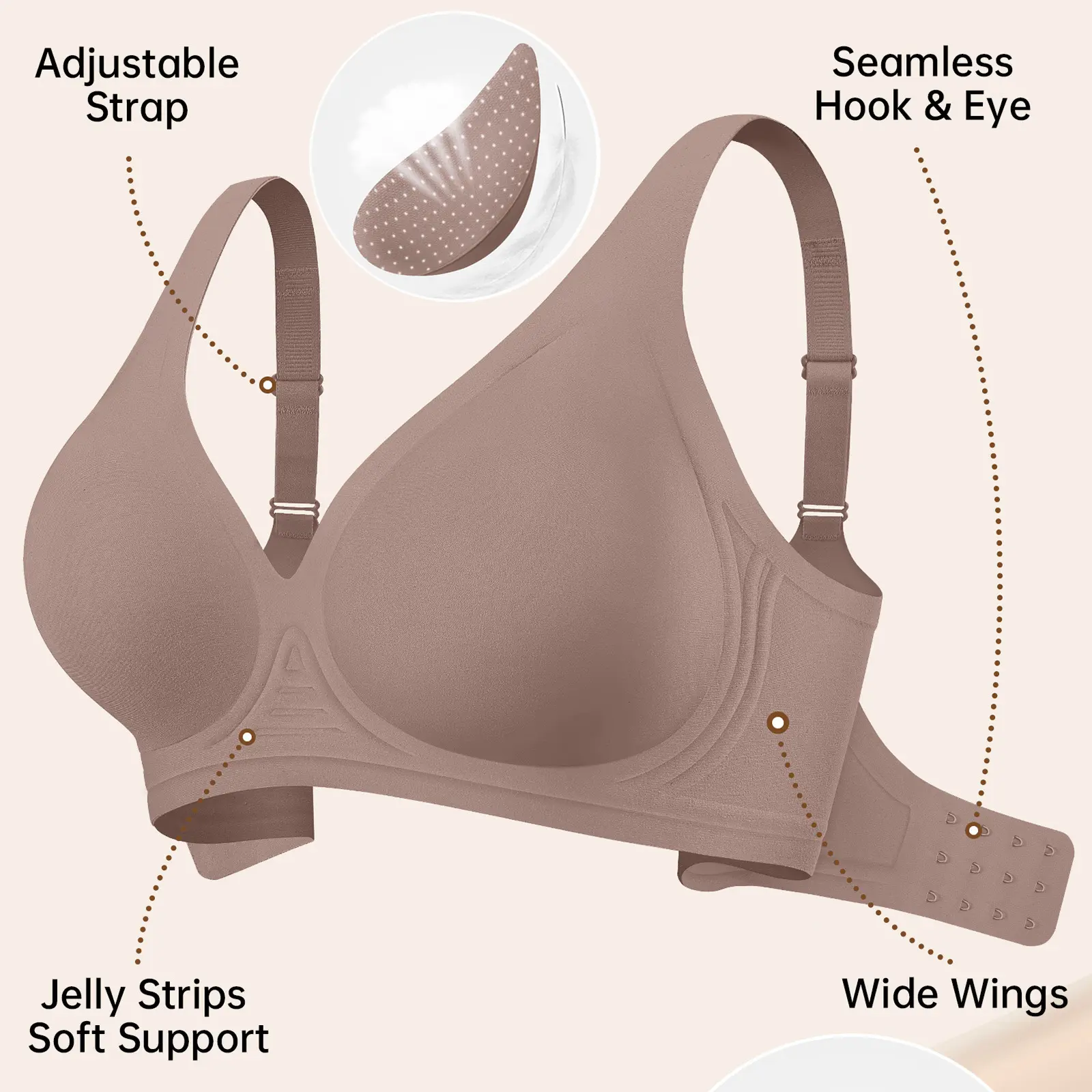 This is not a jelly bra as described!! It has a regular thin pad inside similar to sports bra. Very disappointed. The material itself is soft, fits comfortably. However the cup itself is not great. It does not have support at the bottom. It has the pad that is visible which you cannot remove.