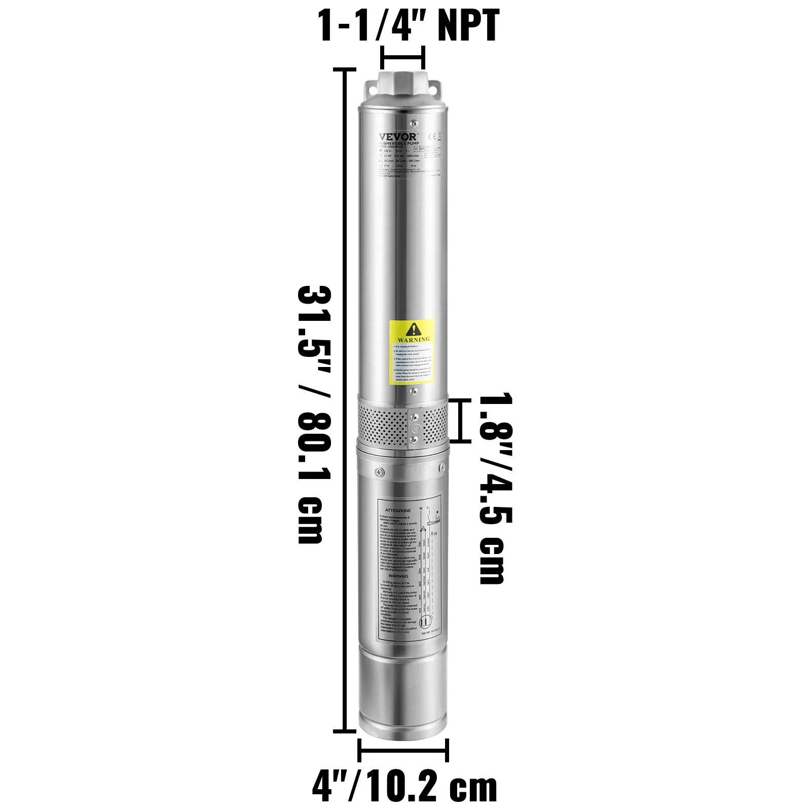 • Enhanced Pump Flow & Head: Power: 1HP, 115V; Diameter: 4" (for 4" or bigger well casing); Discharge: 1-1/4" NPT. This deep well submersible pump is designed with 6-stage thermoplastic impellers, providing 37GPM max flow and 207 ft max head. It comes with a 33 ft electric cord, making life without modern plumbing a lot easier. Pump out your worries with ease and relax. No challenge is too big for you.