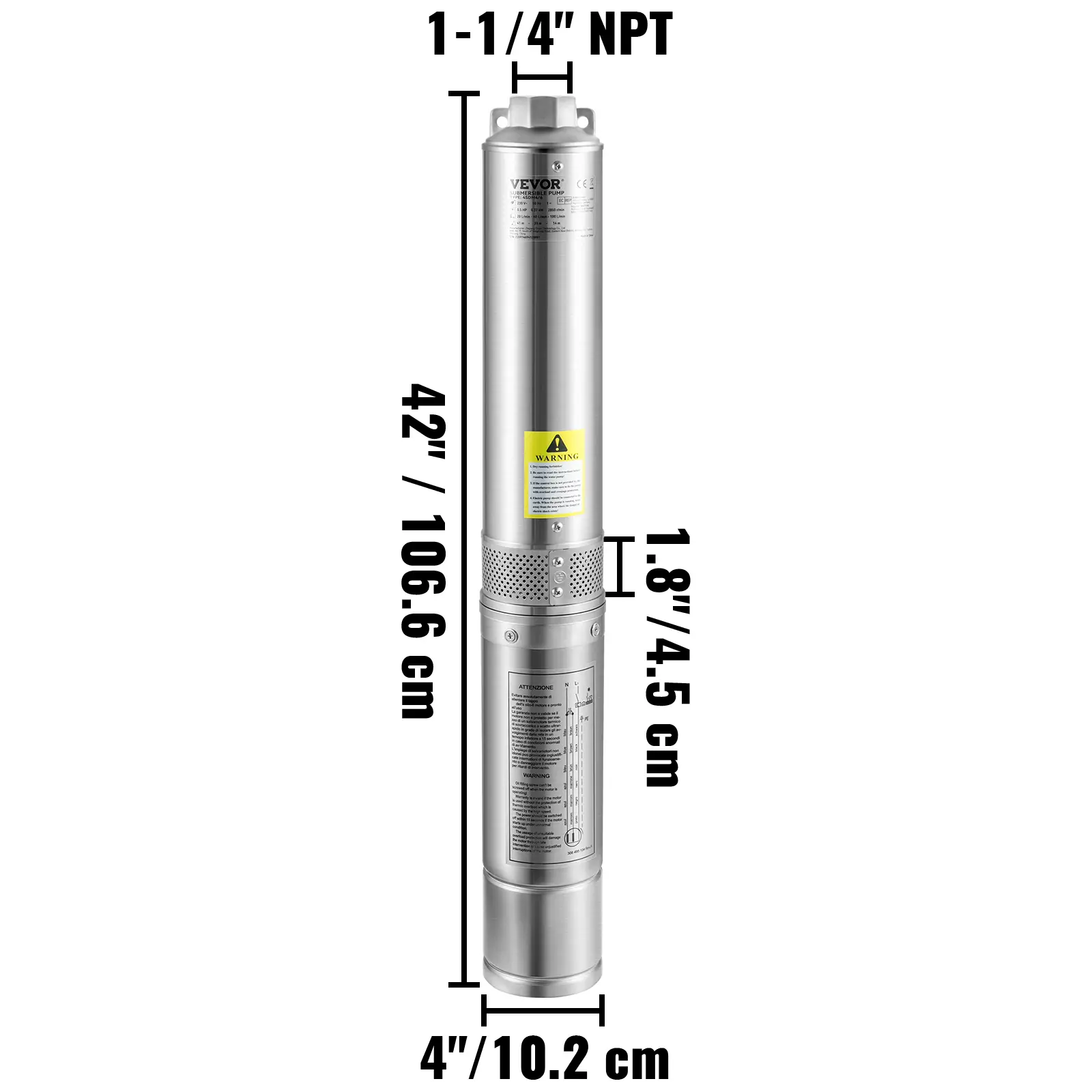 • Enhanced Pump Flow & Head: Power: 2HP, 230V; Diameter: 4" (for 4" or bigger well casing); Discharge: 1-1/4" NPT. This deep well submersible pump is designed with 12-stage thermoplastic impellers, providing 37GPM max flow and 427 ft max head. It comes with a 33 ft electric cord, making life without modern plumbing a lot easier. Pump out your worries with ease and relax. No challenge is too big for you.
