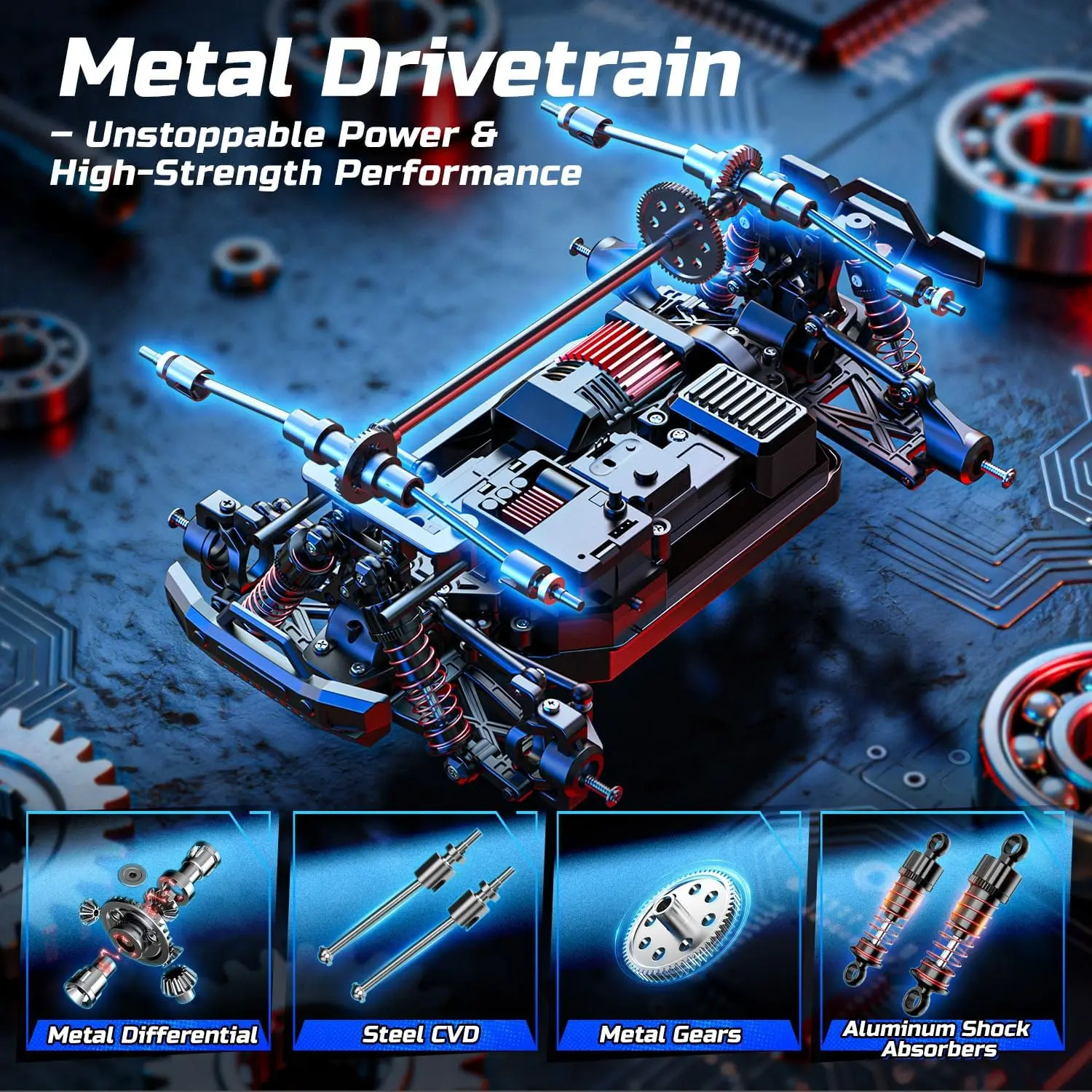 Built for aggressive driving. Steel CVD drive shafts, metal gear differential, aluminum shock absorbers, and a responsive 3-wire torque servo provide smooth handling, precise steering, and long-lasting durability during high-speed drifting.