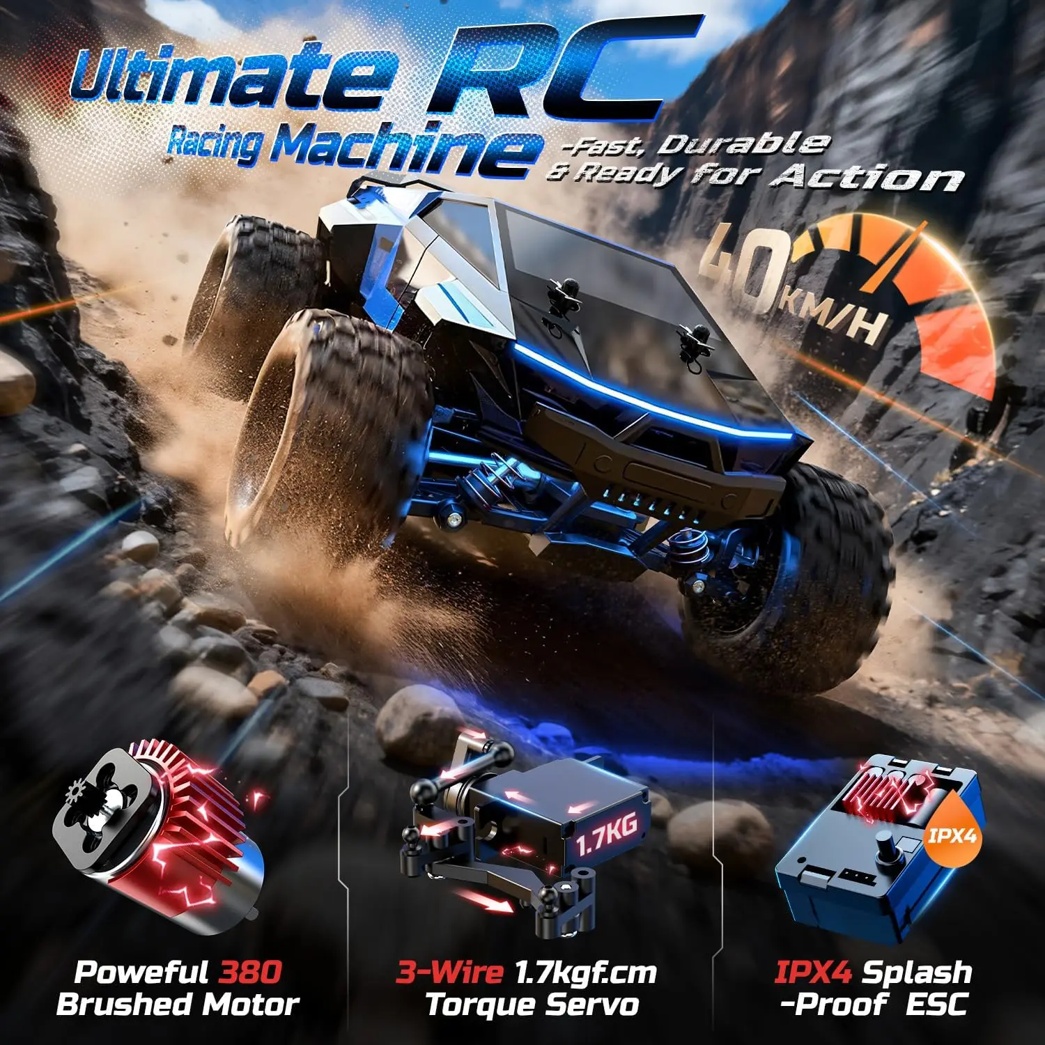 Feel explosive acceleration with the high-performance 380 brushed motor and IPX4 splash-proof ESC. This 1:18 scale RC car reaches speeds up to 40KM/H, delivering heart-pounding racing action on streets, parking lots, or tracks.