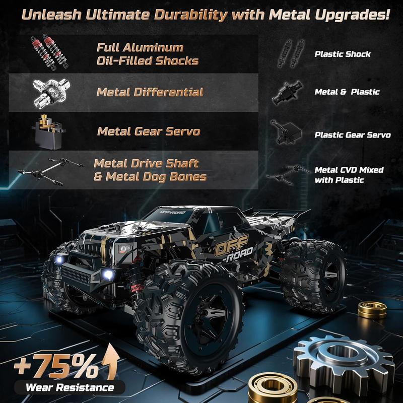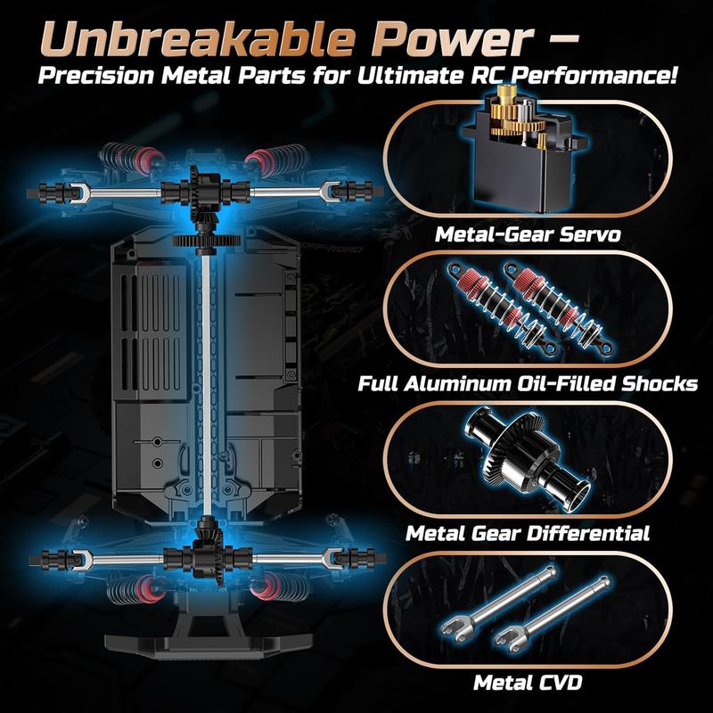 ·【All-Metal Power System – Built to Dominate】Equipped with metal oil-pressure shocks, metal differential, metal drive shaft, and a metal gear servo, this RC truck features a full-metal drivetrain built for extreme durability and performance. Conquer sand, mud, gravel, and grass with ease—feel the thrill of real off-road racing!
