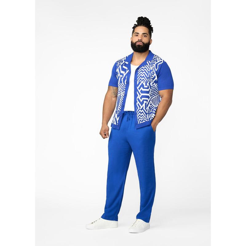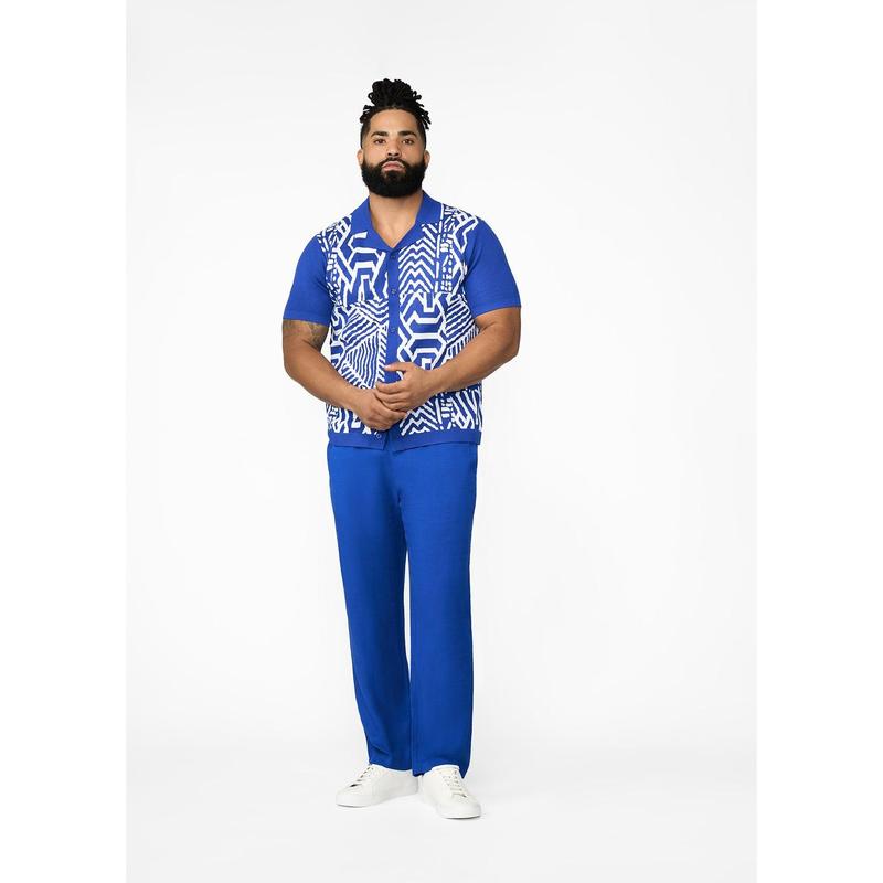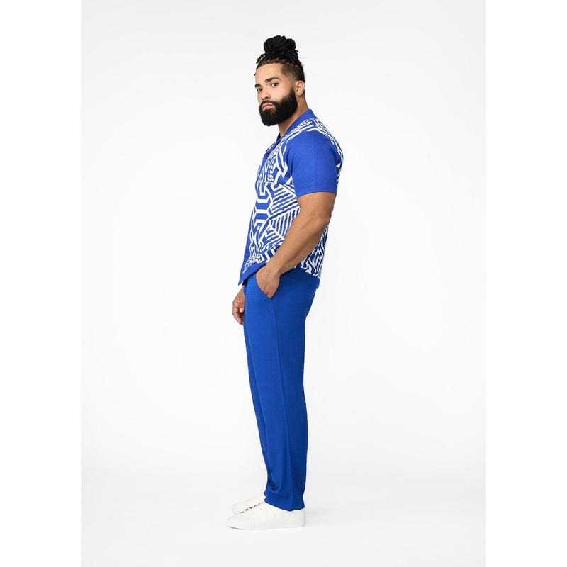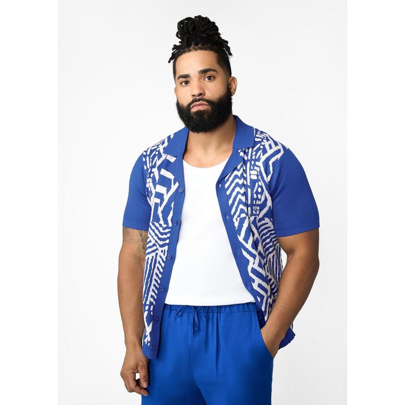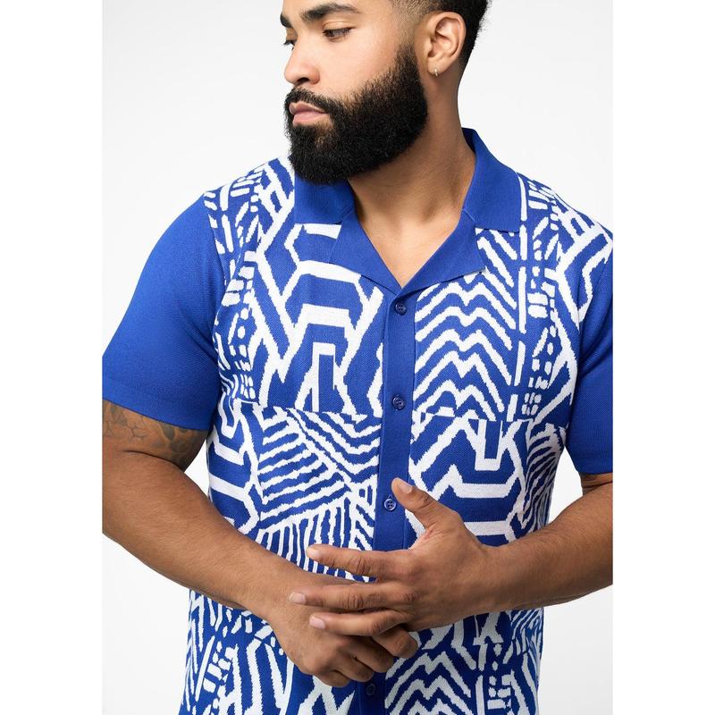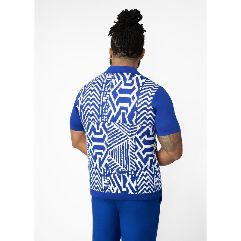 Degan Men's African Print Knit Shirt (White Cobalt Tribal)