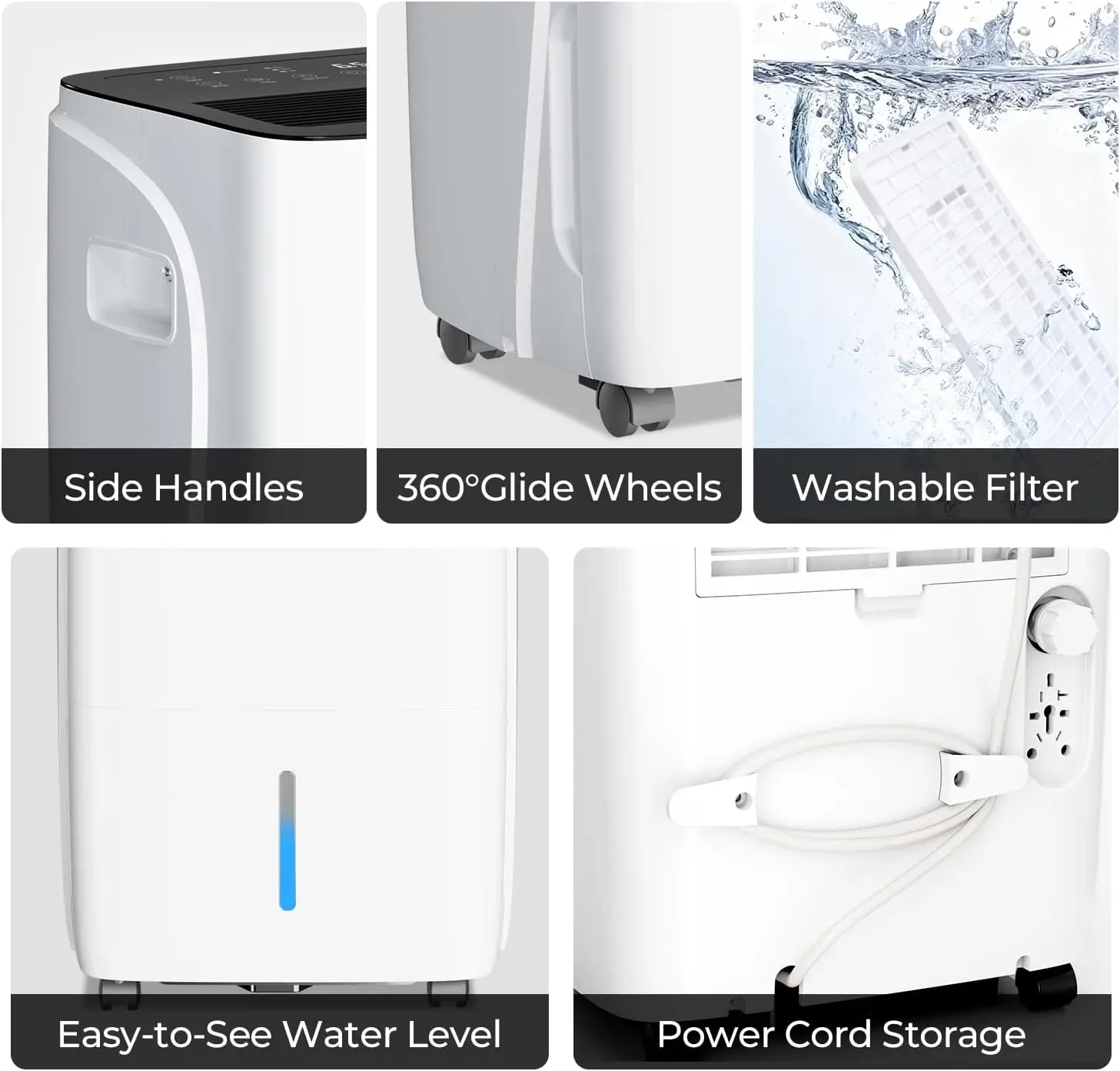 ·Portable Design: Ergonomic handle and 360° swivel wheels for easy movement. Removable water tank and auto-defrost function for effortless maintenance.