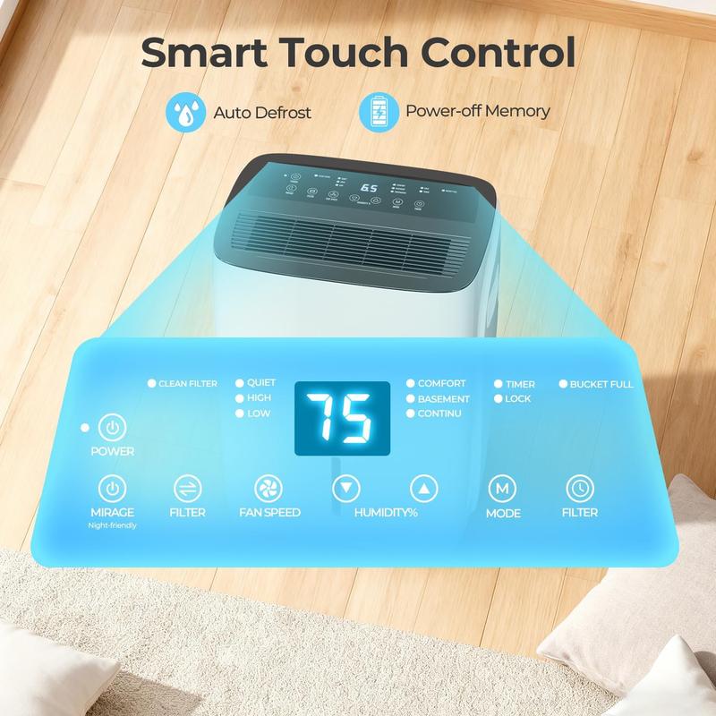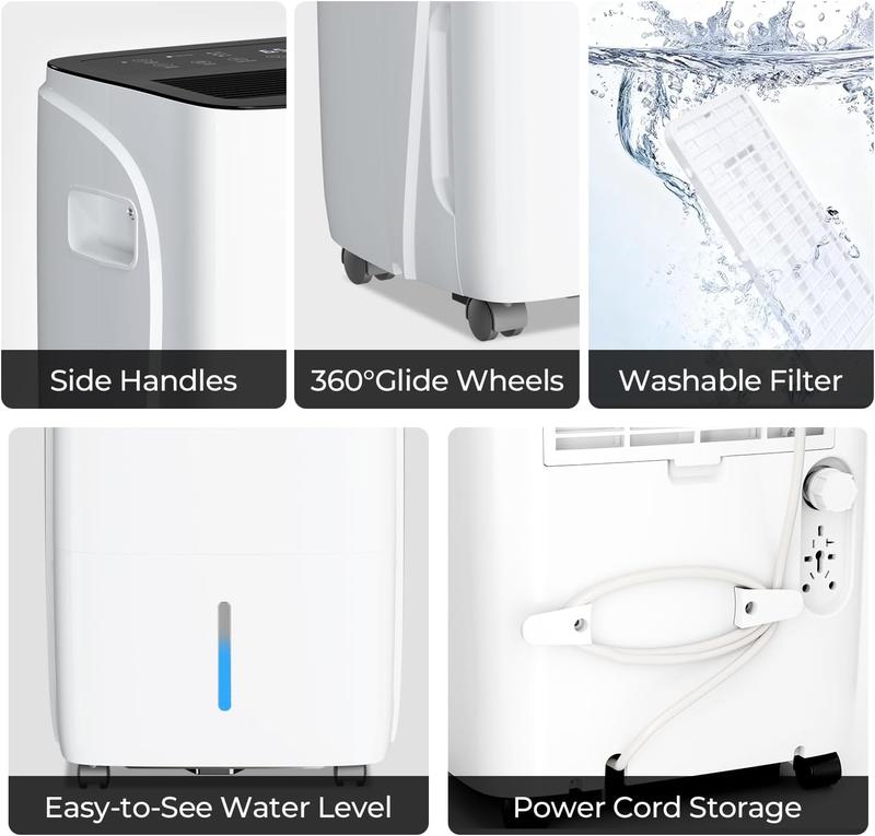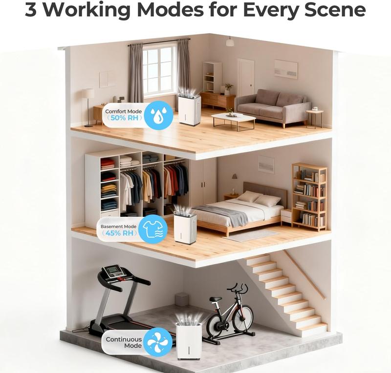 ·Smart Modes: Comfort Mode (50% RH), Basement Mode (45% RH), and Continuous Mode for severe moisture issues.