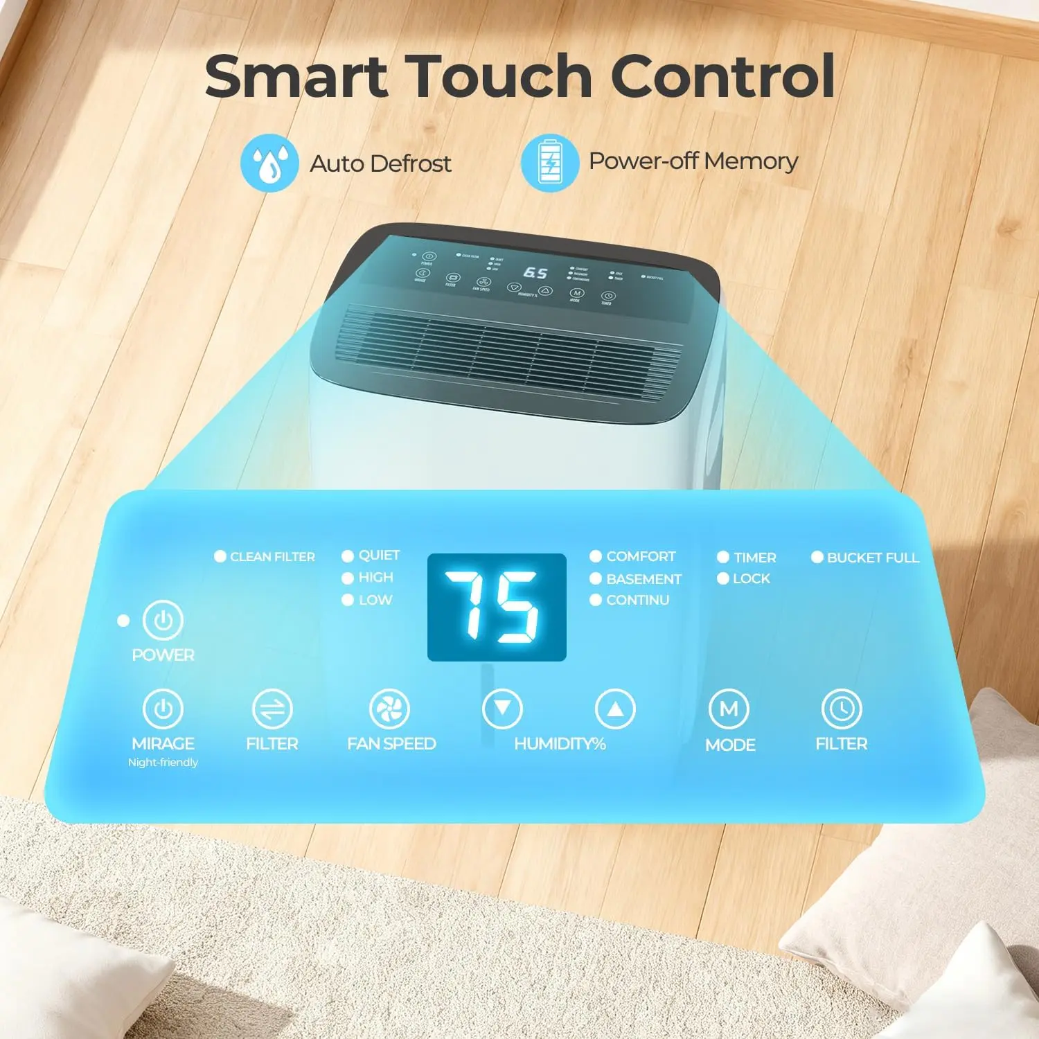 ·User-Friendly: Touch control panel for one-tap setting of target humidity, fan speed, and timer. Auto-restart memory.