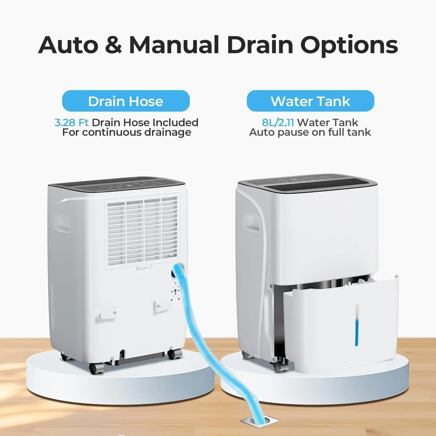 ·Hassle-Free Drainage: 8L transparent water tank with auto-shutoff and alert when full. Includes a 3.28ft (1m) drain hose for continuous drainage.