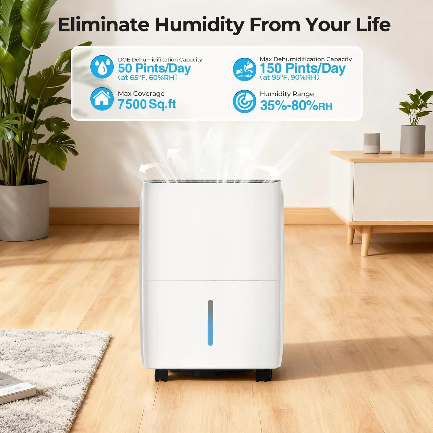 ·Powerful Dehumidification: Delivers up to 150 pints of moisture removal daily (at 95°F, 90% RH) and 50 pints under DOE standard (65°F, 60% RH).