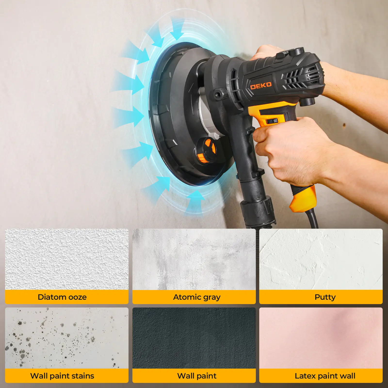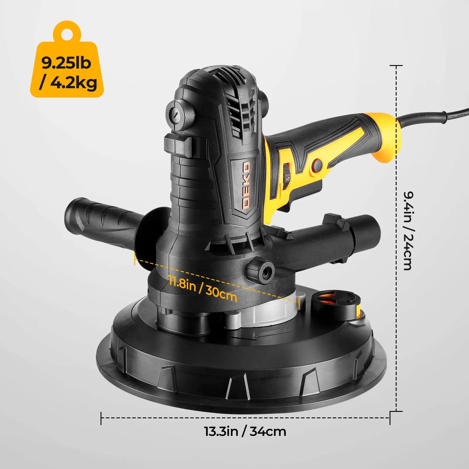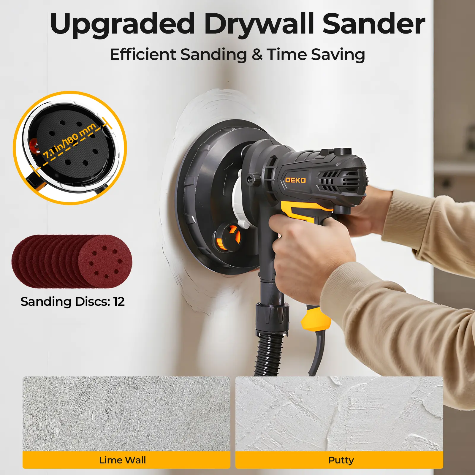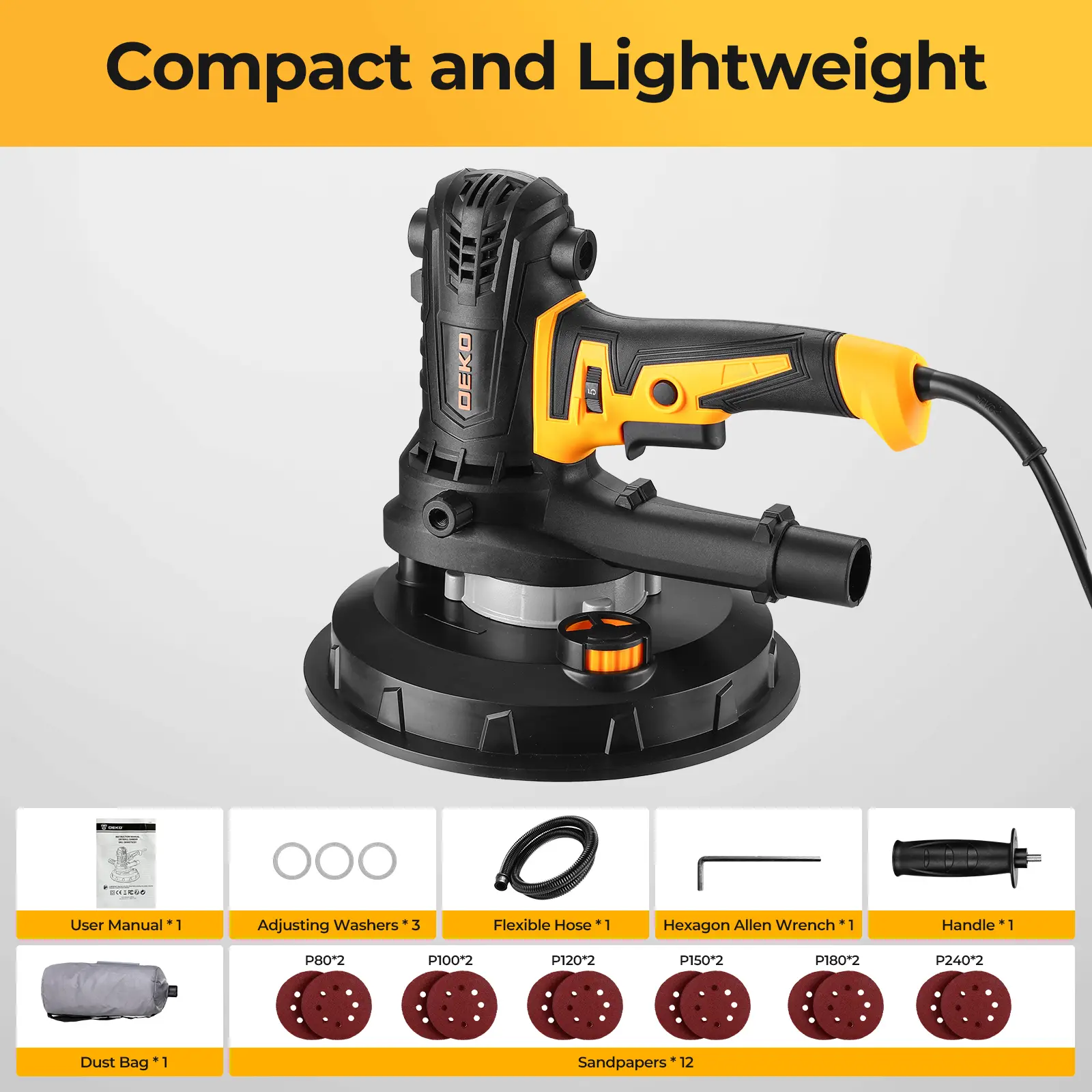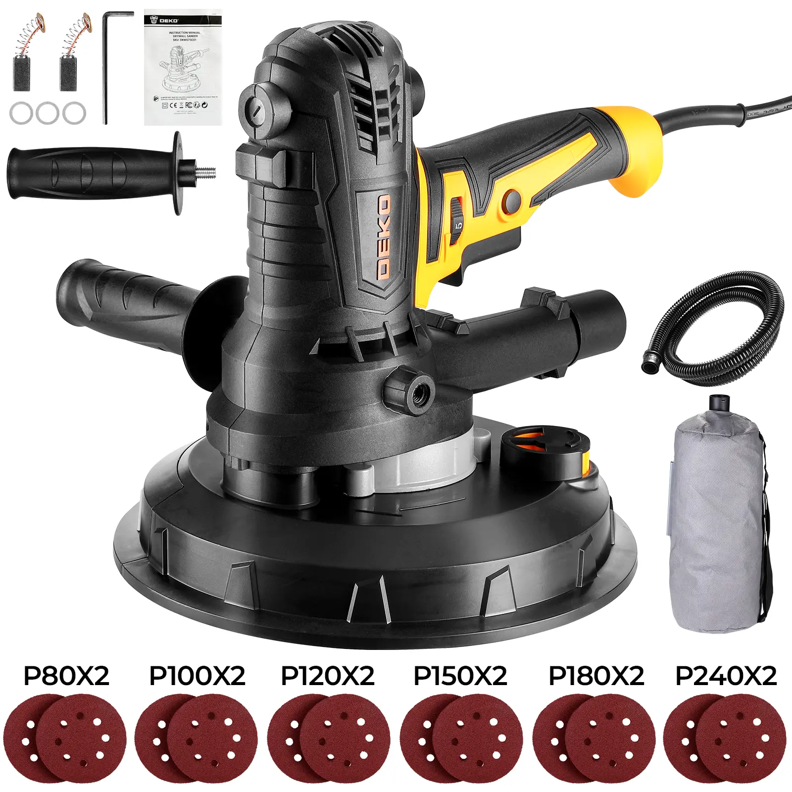 5. DEKO Electric Drywall Sander With 12 Sanding Discs, LED Light, Detachable Dust Bag, Variable Speed 1400–2700 RPM, 175mm 7.5A/900W Handheld Wall Sander For Rough & Fine Sanding, Paint Prep, Sturdy Construction, Ceiling & Wall Finishing