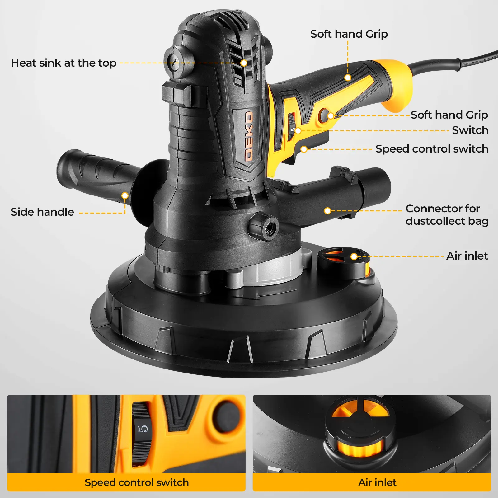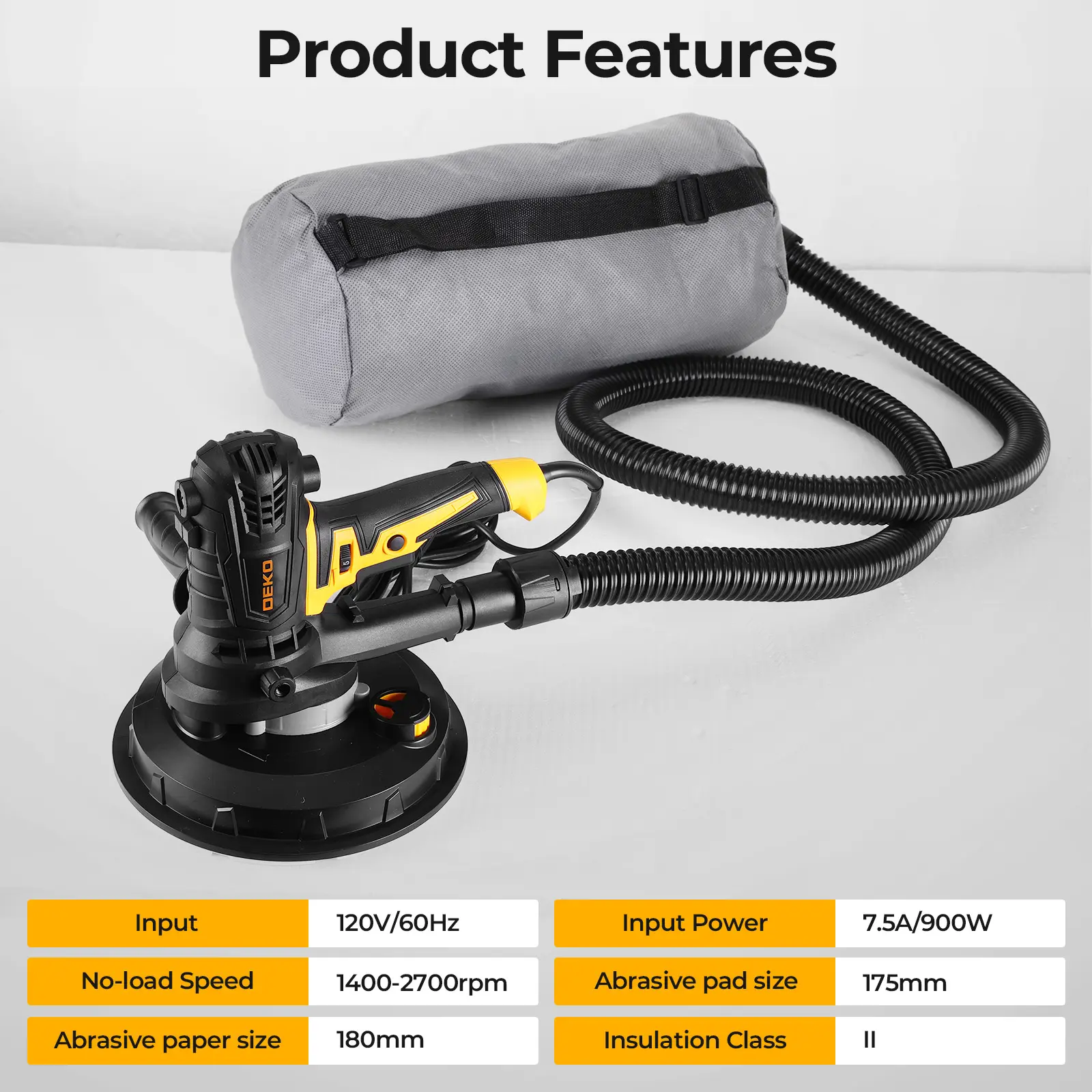 DEKO Electric Drywall Sander With 12 Sanding Discs, LED Light, Detachable Dust Bag, Variable Speed 1400–2700 RPM, 175mm 7.5A/900W Handheld Wall Sander For Rough & Fine Sanding, Paint Prep, Sturdy Construction, Ceiling & Wall Finishing