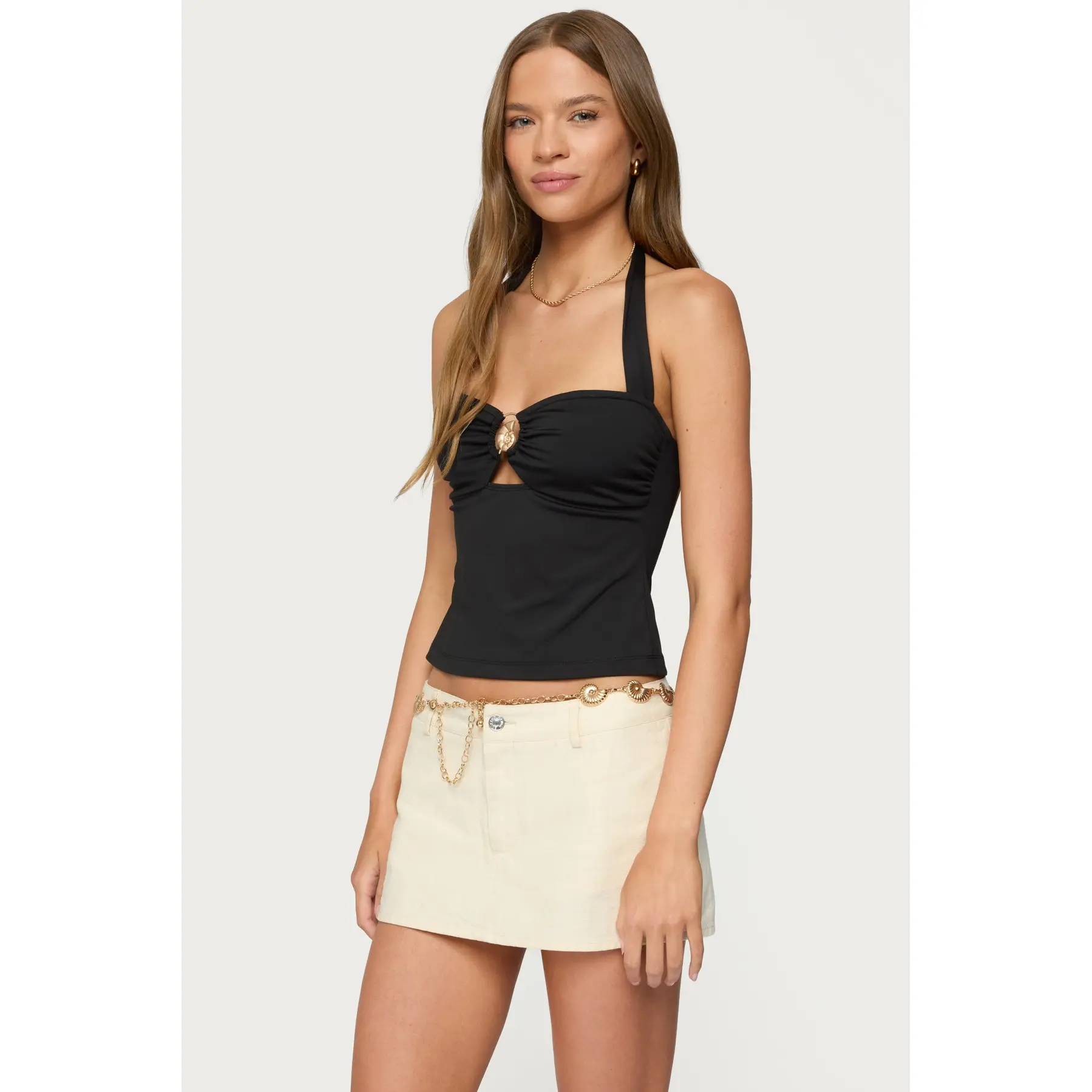 LOVE this halter top - get it while it’s still half off rn‼️  @Edikted #ootd #fashiontiktok #fyp #summeroutfit #outfitinspo  #tanktop #jeans #viral #trendingoutfits #haltertop #lowrise #seashell #gold #beachy