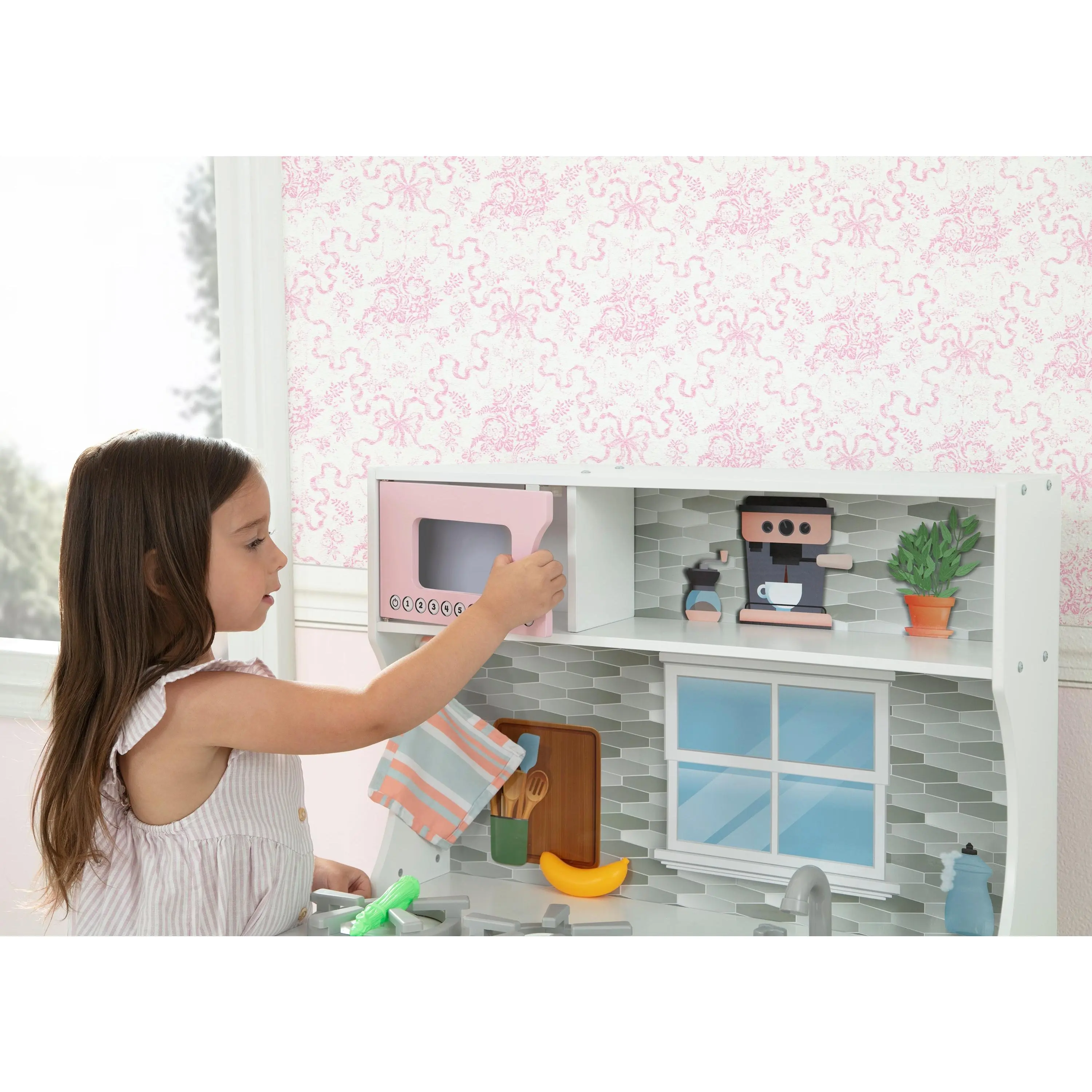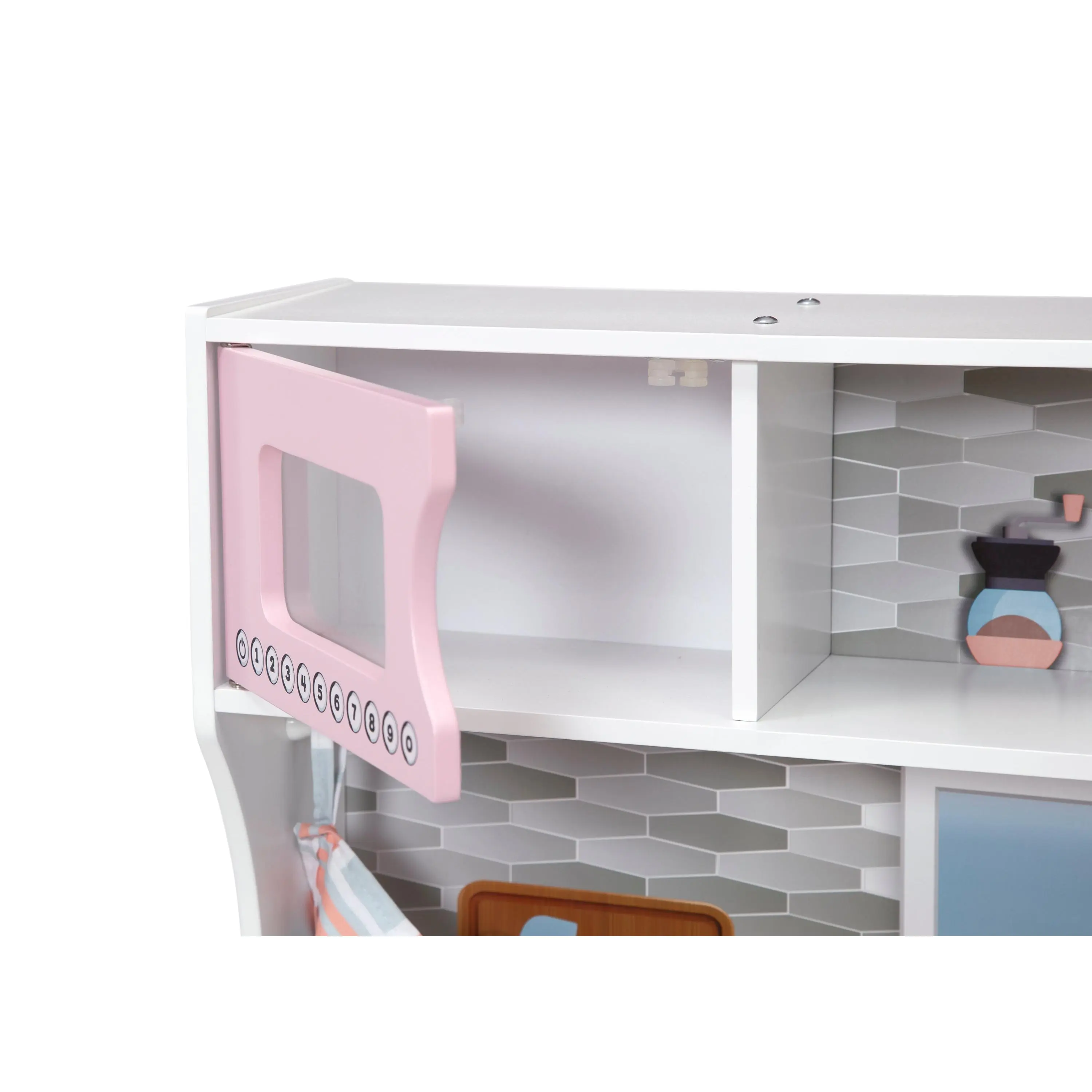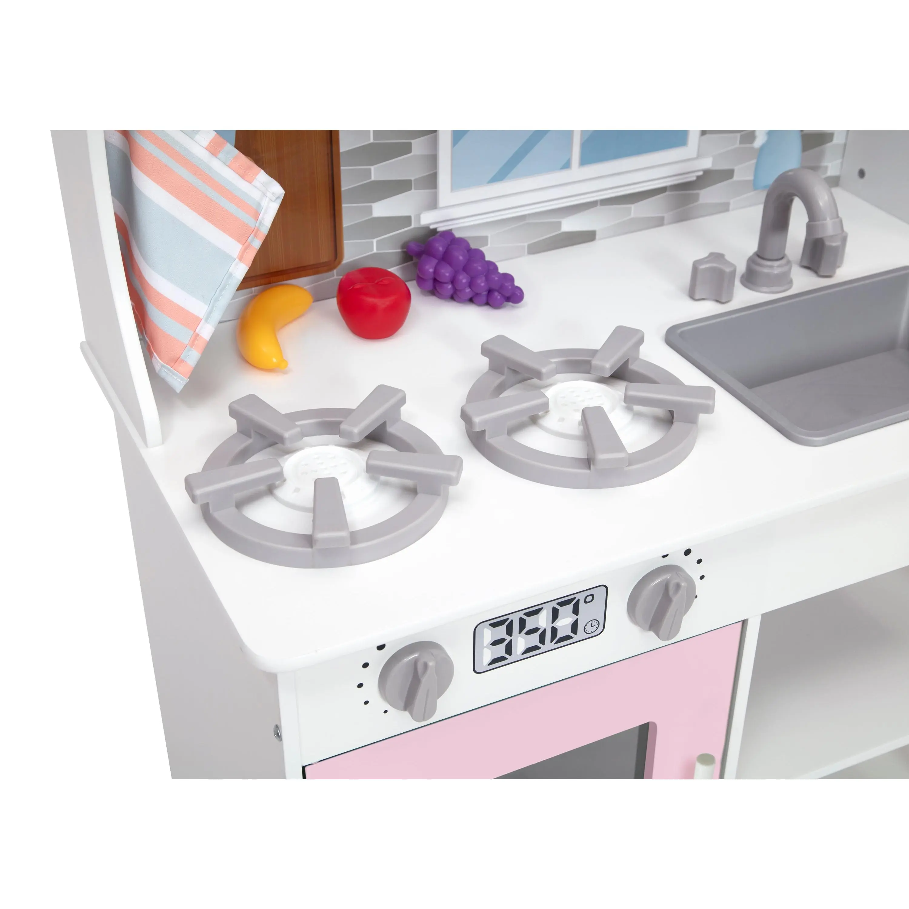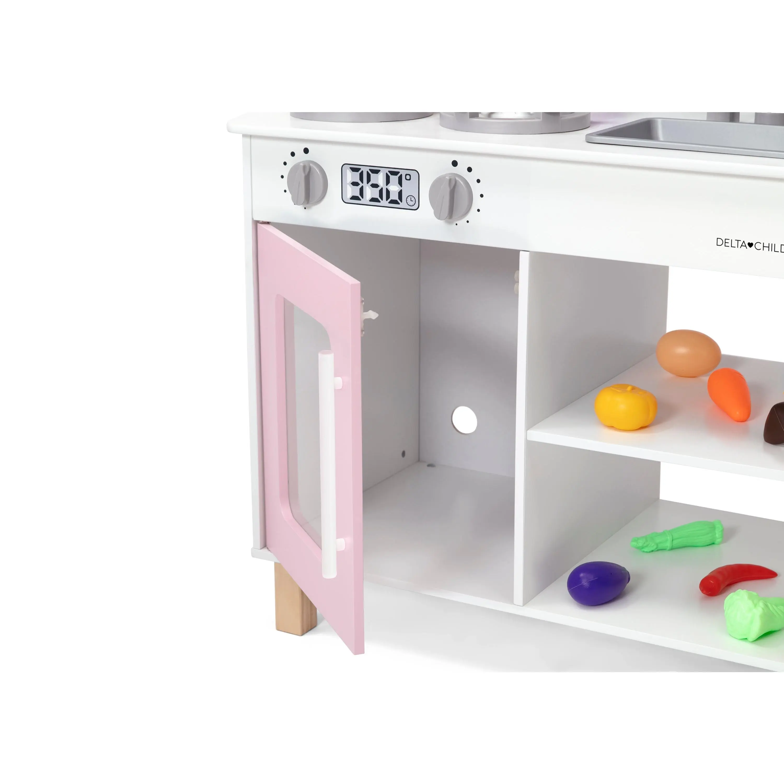 A little cook’s dream come true, the Delta Children Tiny Chef Play Kitchen is the ultimate kitchen setup with tons of interactive opportunities. Featuring knobs that turn and click and appliance doors that open and close, this play kitchen allows kids to exercise their creativity, imagination, and real-world learning abilities. The included accessories feature 15 pieces of fruit and vegetables that encourage kids to interact and mimic everyday kitchen tasks they see from adults. Functional shelving provides plenty of convenient storage to stow everything away. Assembly is refreshingly easy with the included step-by-step instructions and high-quality hardware.