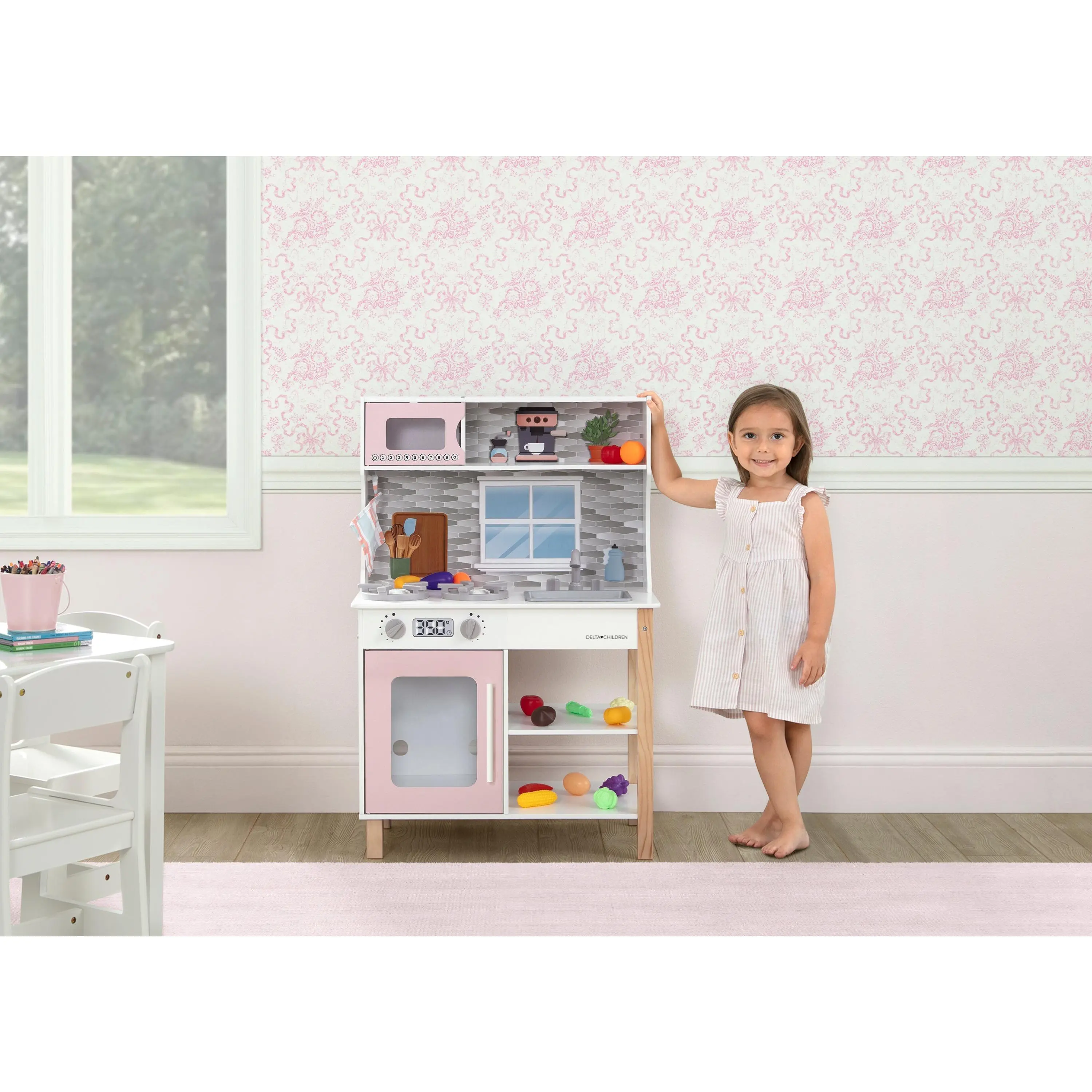 Tiny Chef play kitchen, this play kitchen is perfect for toddlers. I love how it comes with the plate food as well. @Delta Children #playkitchen #toddlerkitchen #montessorikitchen #toddlergiftideas #toddlerplaykitchen