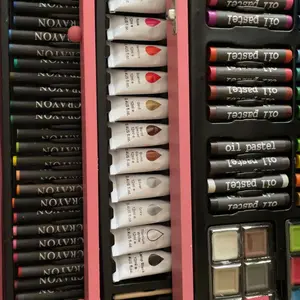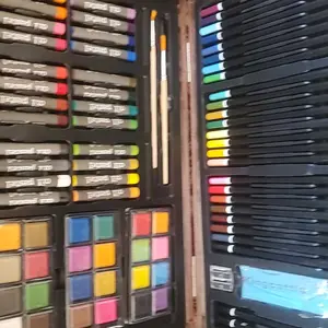 This art set includes 175 pieces: 60 crayons, 24 acrylic paints, 24 oil pastels, 24 color pencils, 24 watercolor cakes, 8 brushes, 3x8-well palettes, 2 drawing pencils, 1 sharpener, 1 sandpaper block, 1 art eraser, 1 x 50-page drawing pad, and 1 x 24-page acrylic pad. It comes in a wooden case, perfect for adults, teens, and artists. Ideal for showcasing drawing talent.