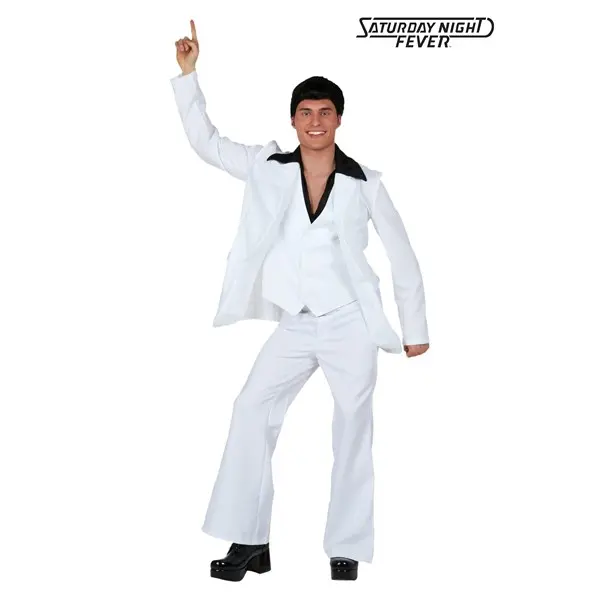 For some guys, dance moves just come naturally. Tony Monero, for instance, just has to hear a little bit of disco and he just can't stop himself. His hips start swaying and his arm just starts waving to the beat. Maybe it's the Bee Gees that give him some of the best moves on the floor, or maybe it's the poofy hair. We like to think it's his awesome suit. It makes him look like a stud and gives him the kind of confidence he needs to shake his groove thing. Don't believe us? Give it a try! This costume comes straight from the character's appearance from Saturday Night Fever.