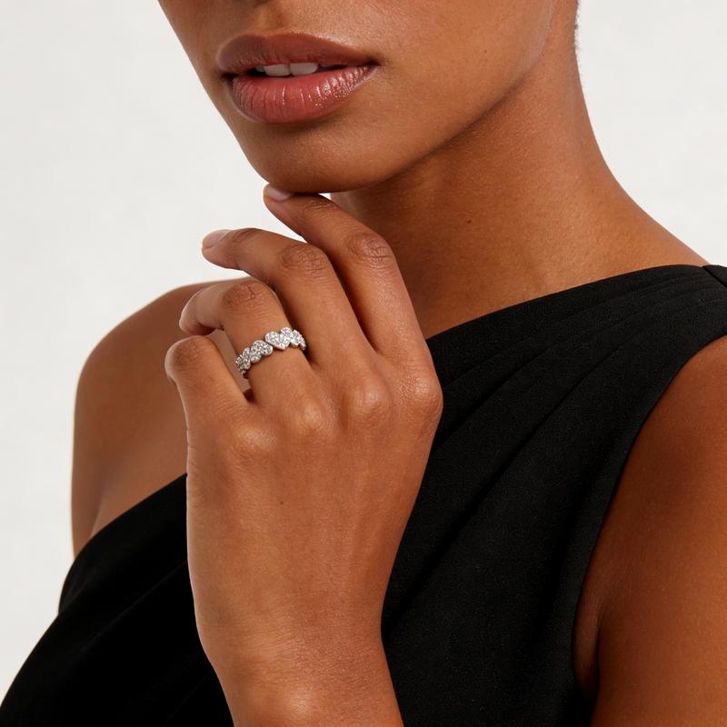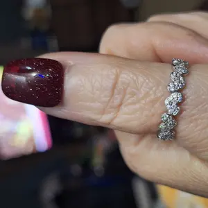 Β·This ring features heart shape that is adorned with dazzling stones, adding a touch of elegance.