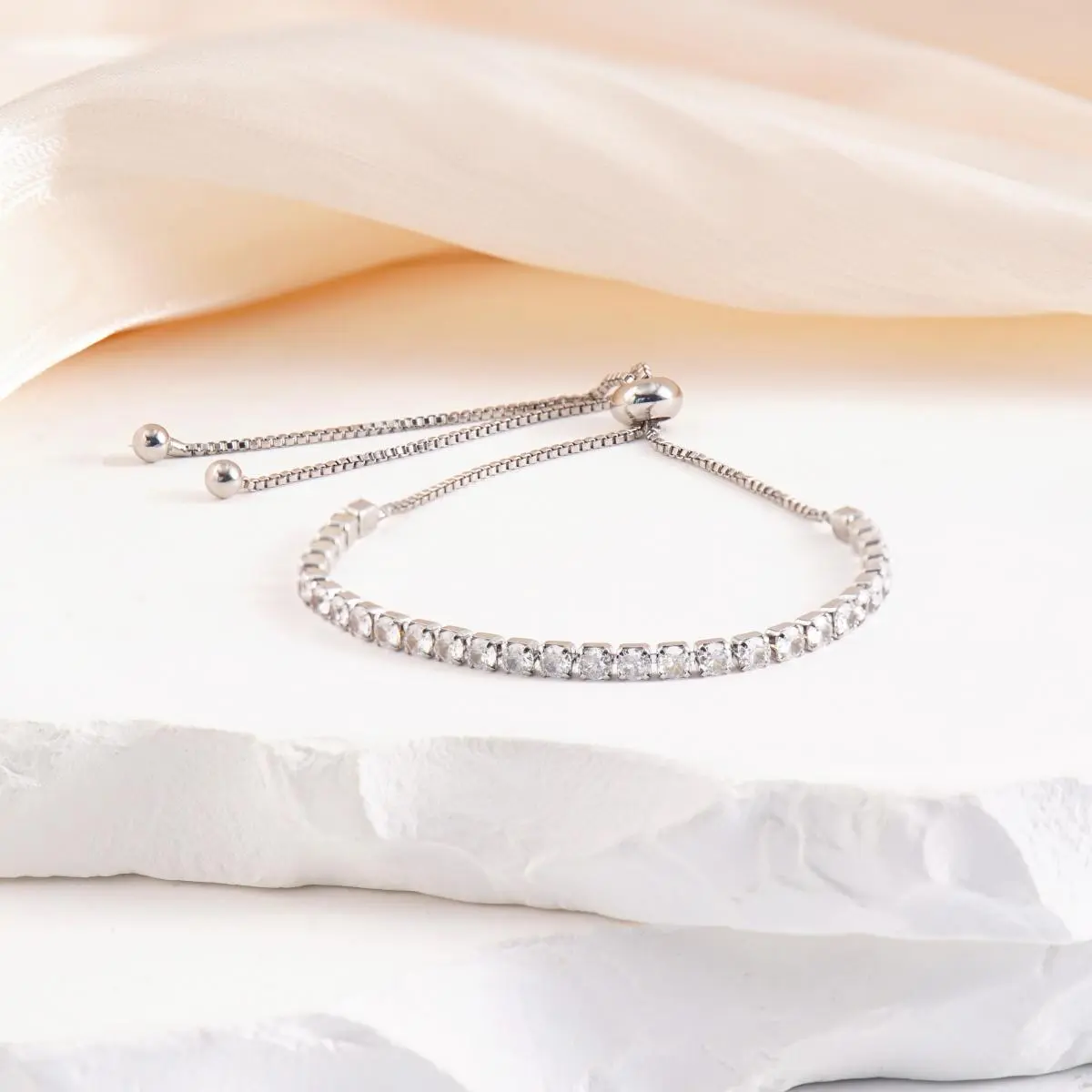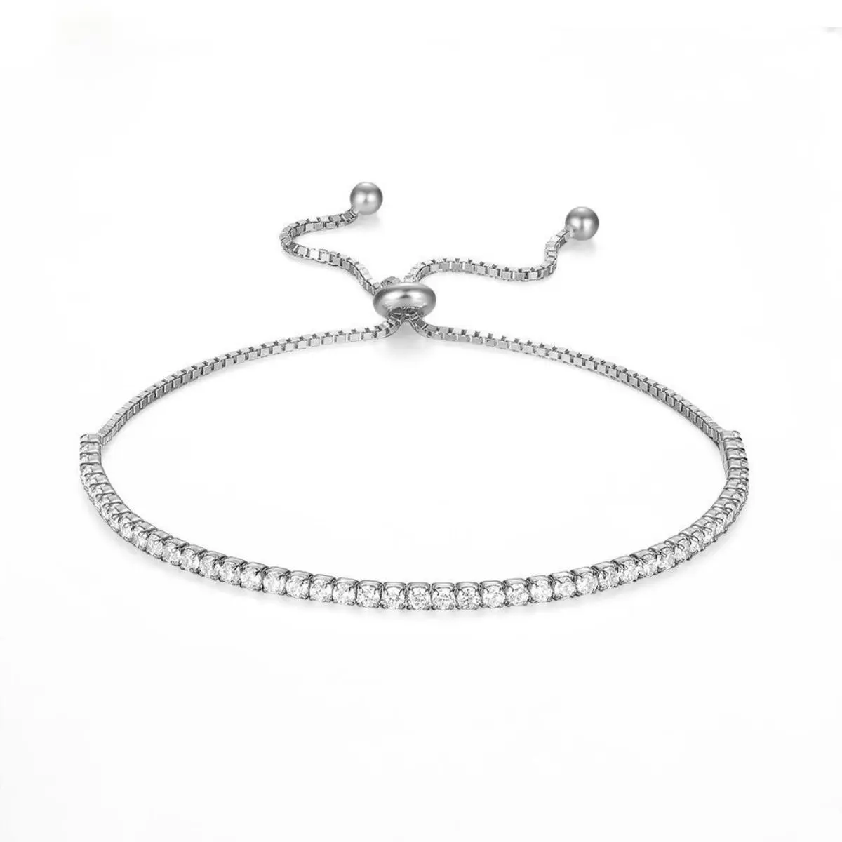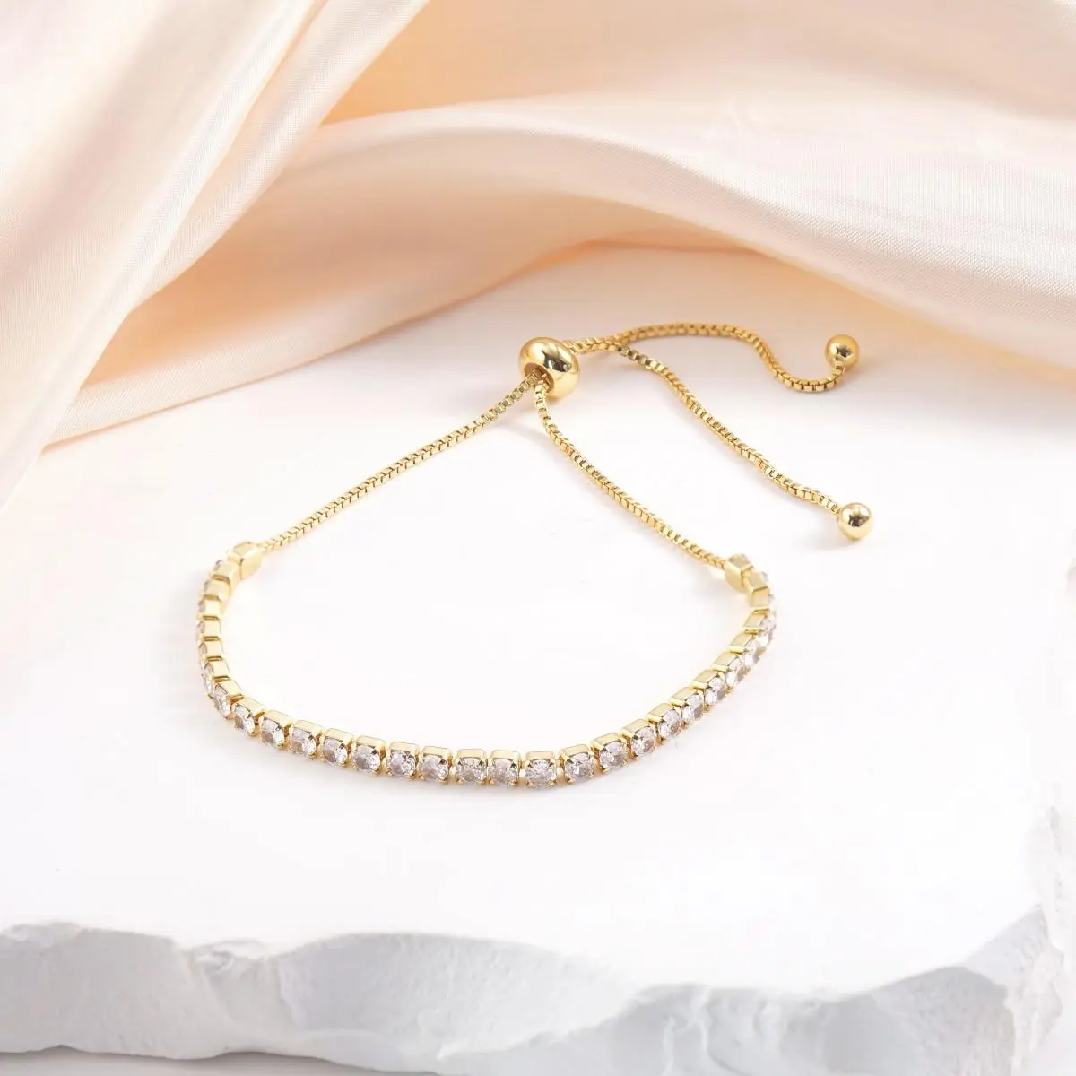 This bracelet is crafted from high-quality copper and adorned with brilliant cubic zirconia, offering a luxurious shine that catches every angle of light. The adjustable slider ensures a perfect fit for any wrist.
