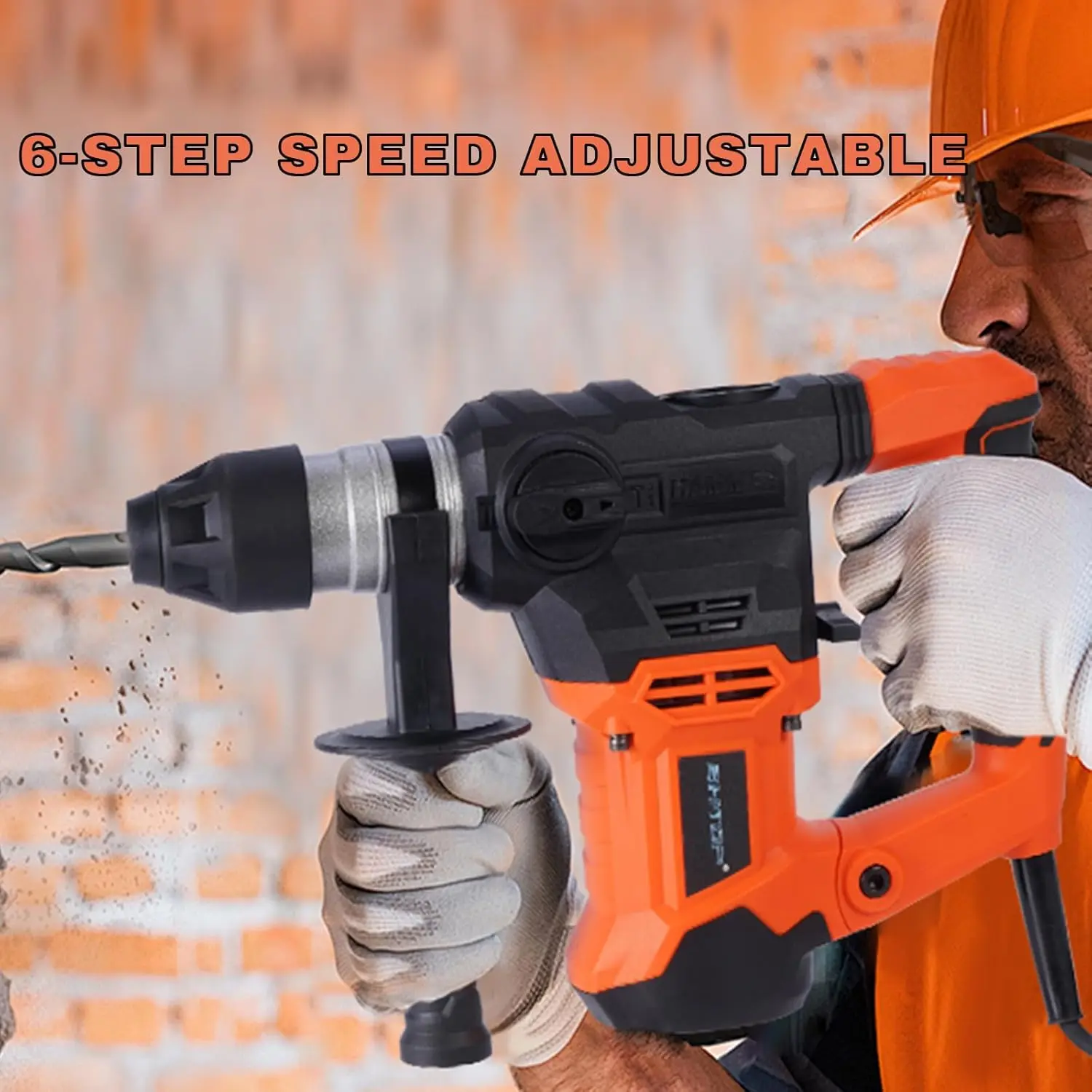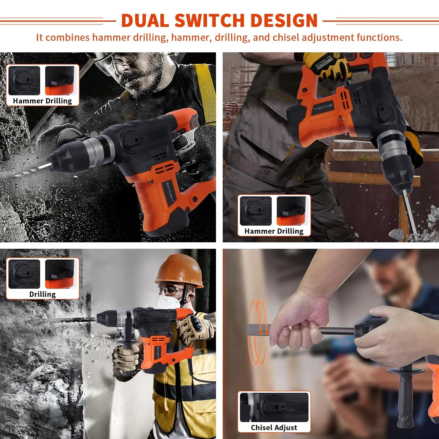 【FOUR FUNCTIONS】 Our rotary hammer offers four different functions of drill only(suitable for , steel , etc.), hammer only(suitable for concrete or brick) ,hammer drill(suitable for heavy duty work) function and chisel position adjustment adapt to variety of work scenarios which are easy to . Easily between functions using our two different switches. The double function design extends the service life by compared to single function switches.