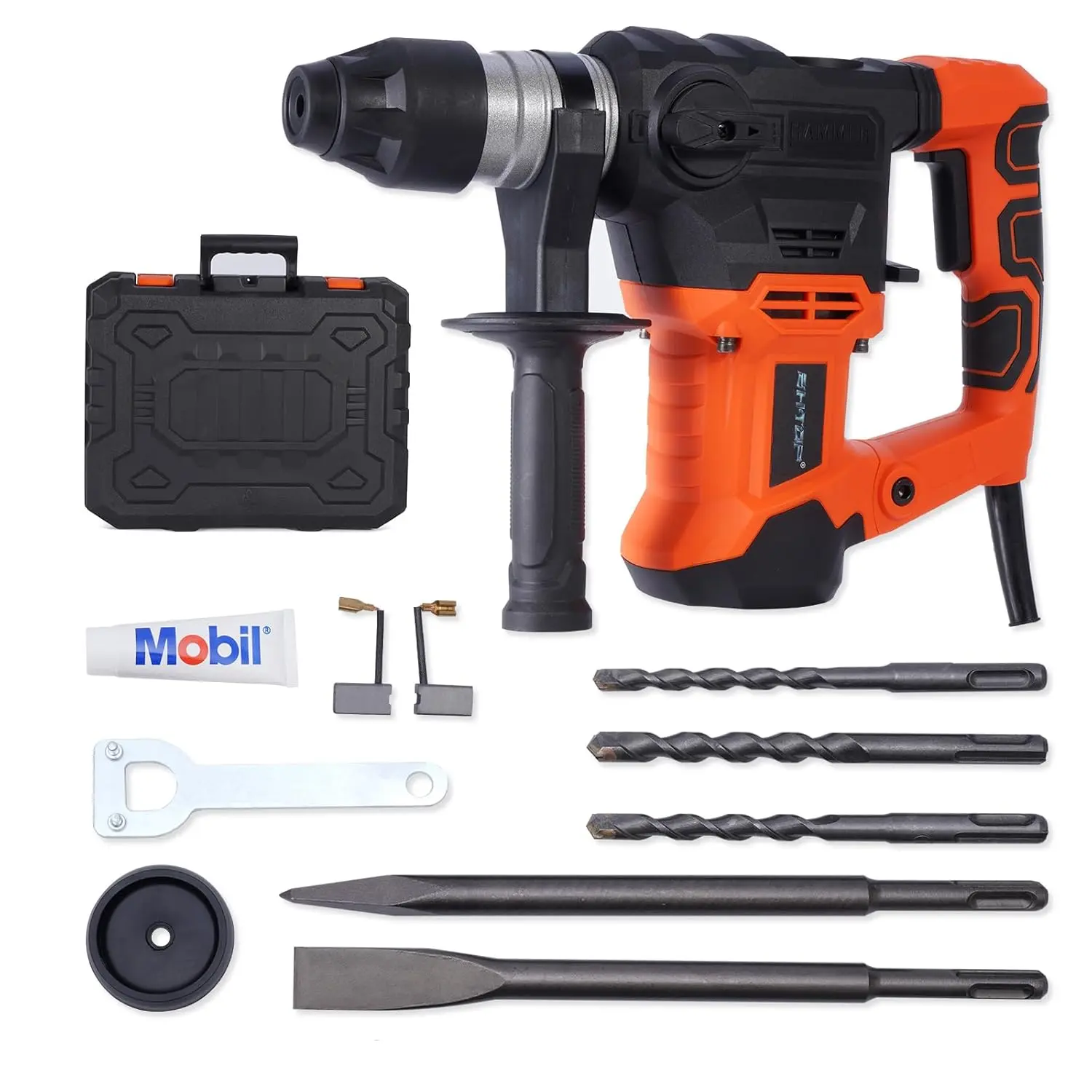 【PACKAGE INCLUDED】Rotary Hammer * 1; Sds-plus Drill Bits(8mm,10mm,12mm) * 3; Sds-Plus 10-inch Chisel * 2; Auxiliary Handle * 1; Replaceable Carbon Brush * 2; * 1; Dust Pproof Cap * 1; Carrying Case * 1. Any question, please contact .