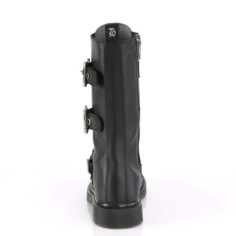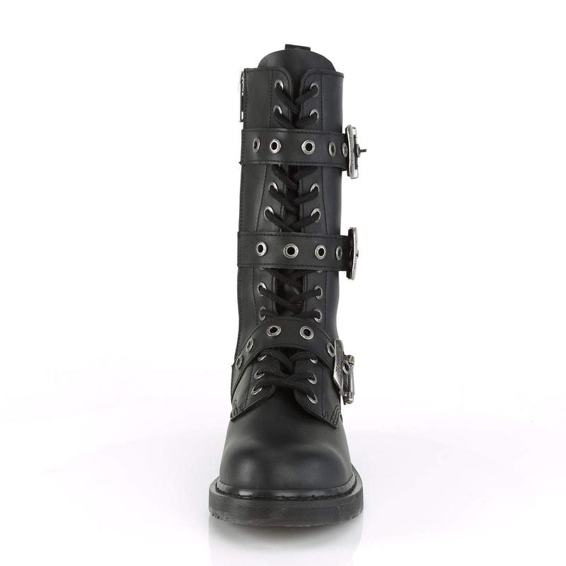 Embrace the fusion of punk and modern fashion with the Bolt-330 mid-calf combat boots. These boots boast a sturdy 1 1/4" heel and are constructed from high-quality black vegan leather, showcasing a commitment to ethical fashion. Designed with a 14 eyelet lace-up system and enhanced by triple buckle straps, they offer an audacious look that complements any outfit. The addition of an inside zip closure adds a touch of practicality to its rugged charm, making them an ideal choice for adventurers of style.