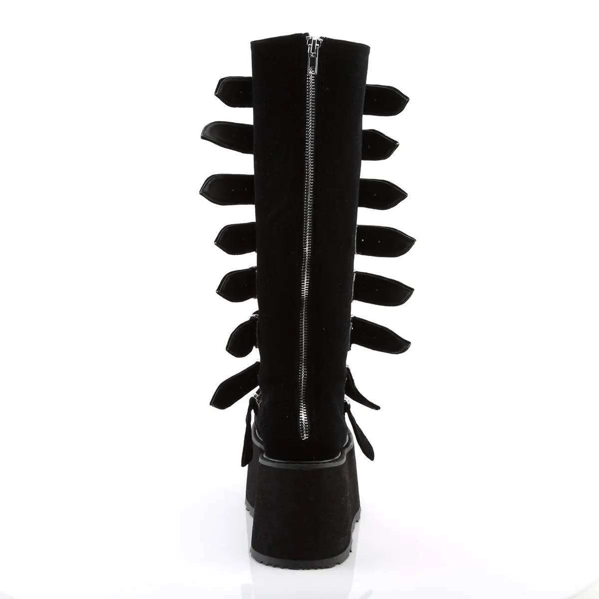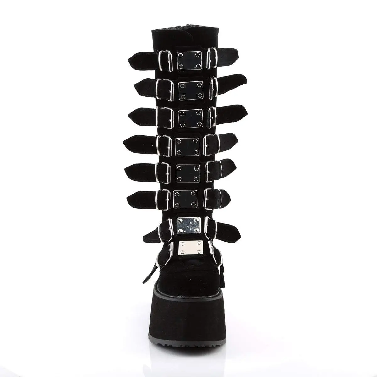 Step into the spotlight with the Damned-318 boots, where daring design meets luxe refinement. This knee-high boot features an impressive 3 1/2" platform for stand-out appeal. Eight buckle straps, detailed with central metal plates, wrap around the boot for a look that's both bold and intricate. Crafted from sumptuous black velvet, these boots offer a lavish touch to any ensemble. A convenient back metal zip closure adds a practical element to its stunning design. Ideal for adding a dramatic flair to your outfits, the Damned-318 boots are a must-have for those with a penchant for the extraordinary.