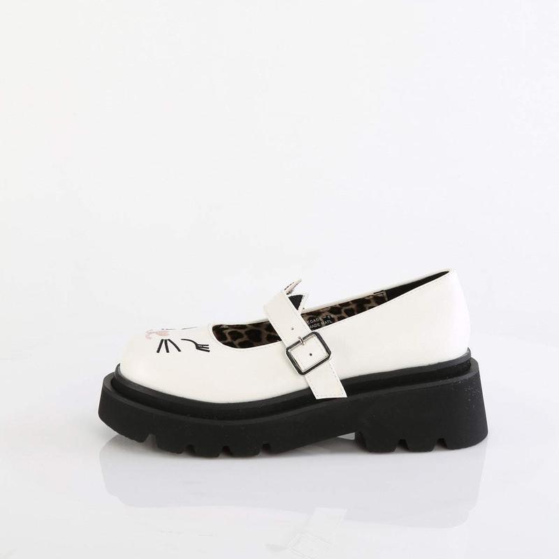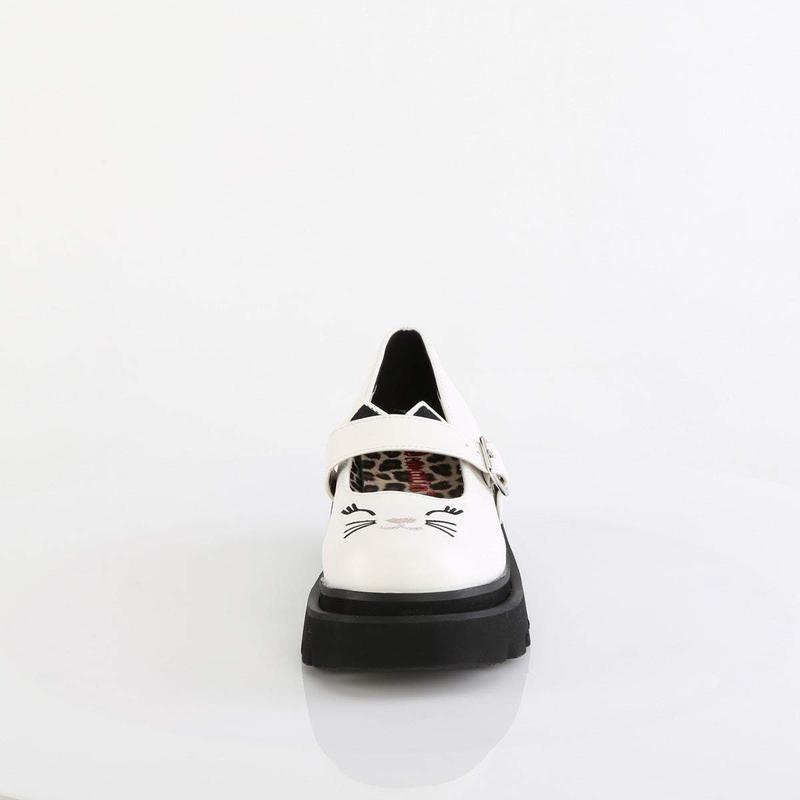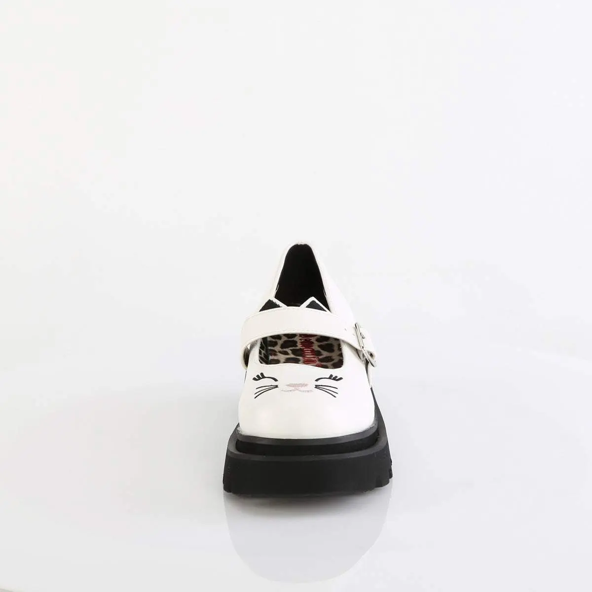 Bring some attitude to your wardrobe with the Renegade-56, a shoe that serves unforgettable style. Featuring cat face embroidery on the toe and ears on the strap, these mary janes will add a dynamic and playful edge to your look. The white vegan leather makes them easy to match with anything in your closet. Whether you're dressing up or down, these shoes are a surefire way to keep things interesting, and to remind yourself to embrace your individuality with confidence.