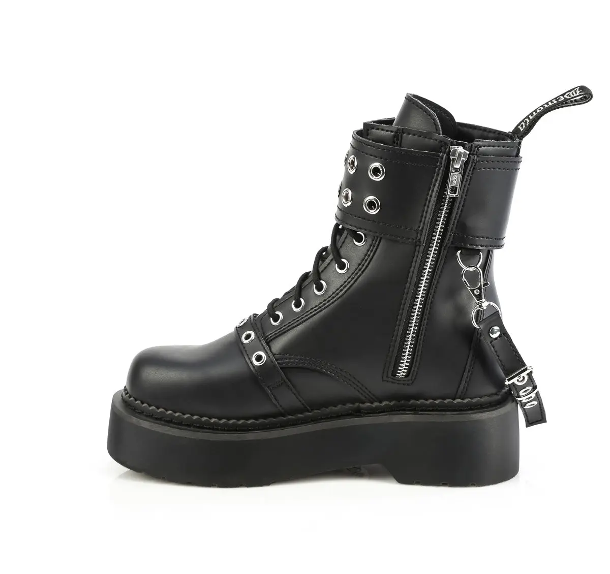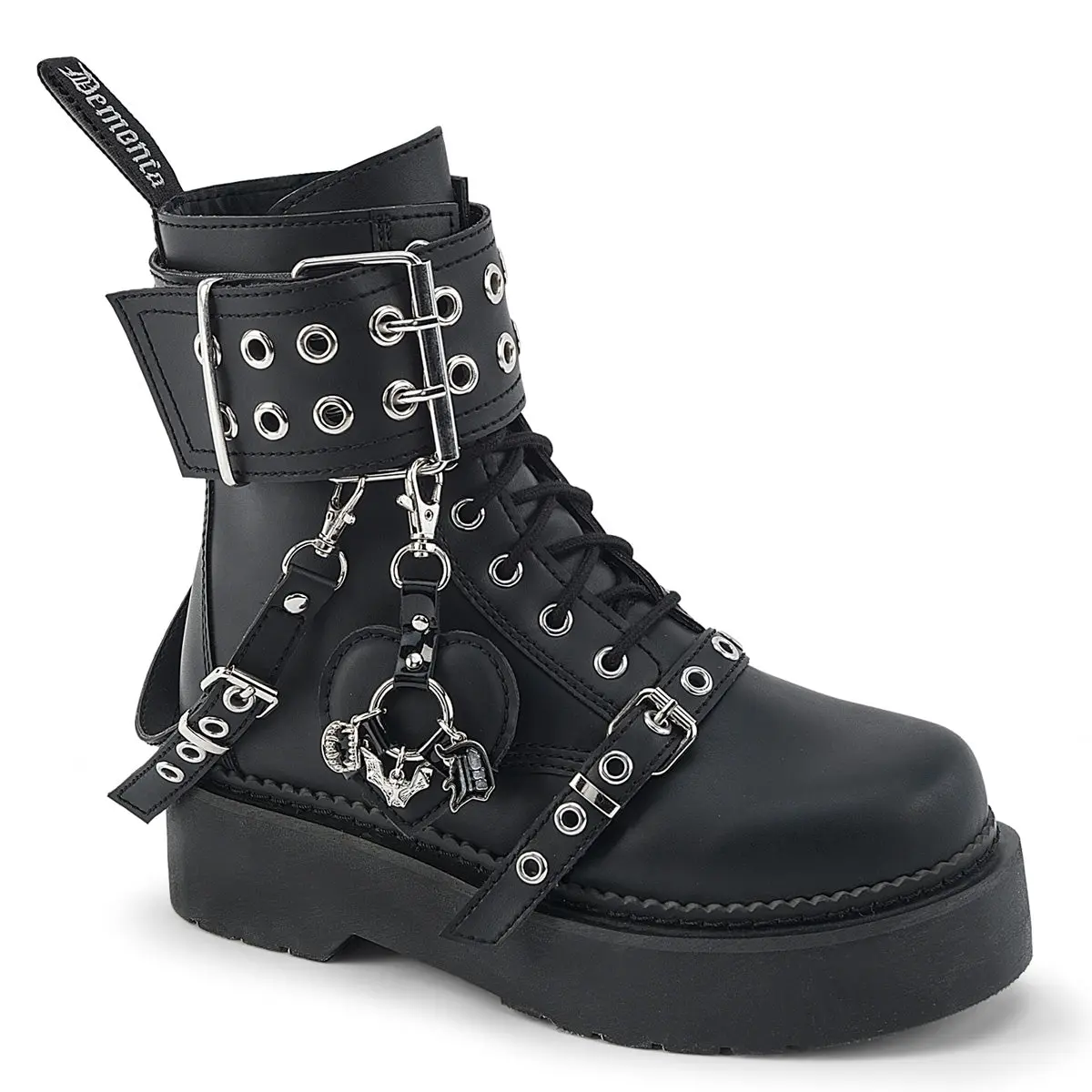 2" (51mm) Stacked Platform 8-Eyelet Lace-Up Combat Ankle Boot, Featuring Double Grommet Upper Buckle Strap w/ Hanging Removable Back Strap, Removable Puffy Heart Bondage Charm and Lower Gromet Strap D